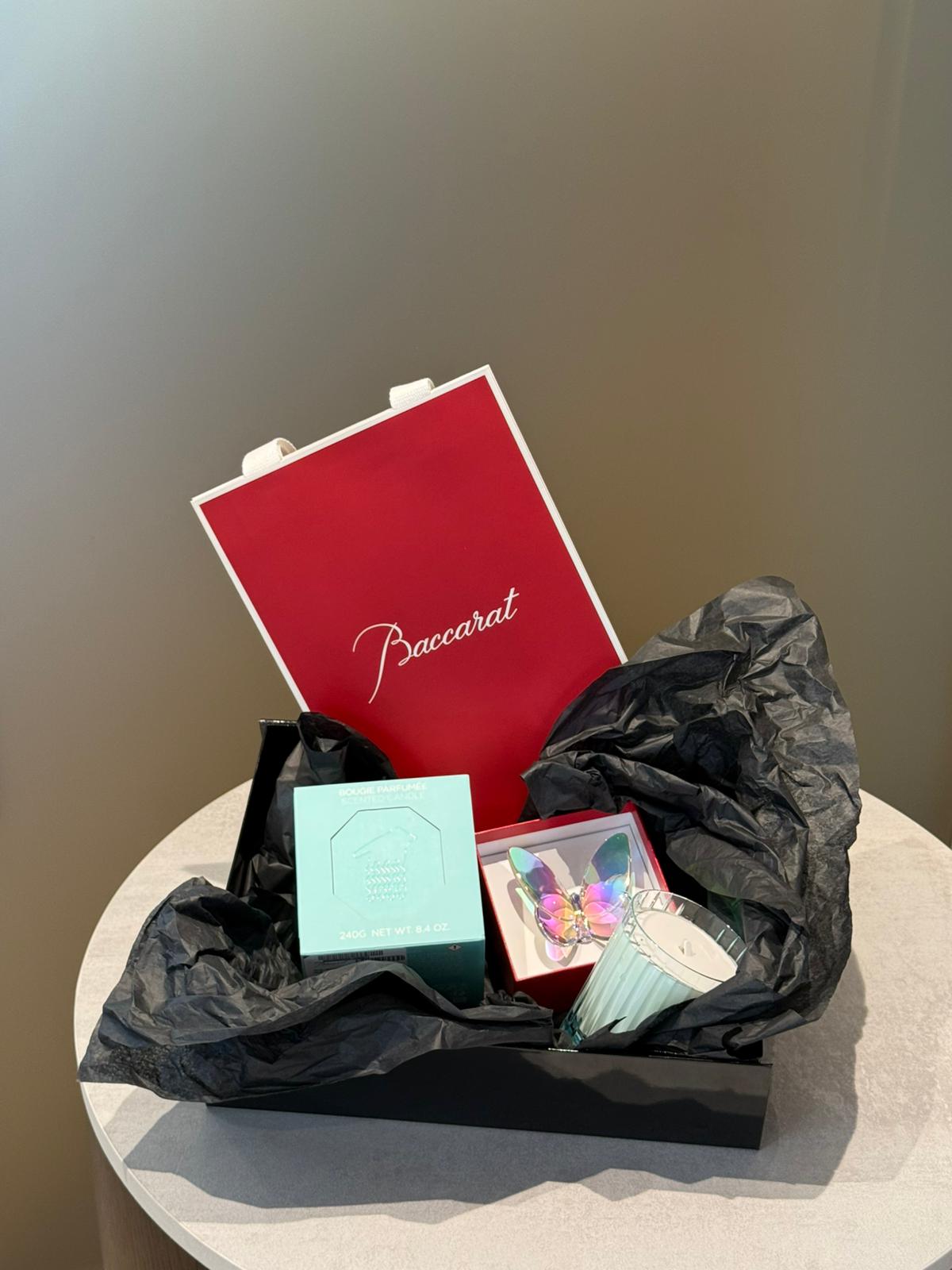 A refined decorative set by Baccarat combining fragrance and crystal artistry. The Près du Lac candle releases a fresh, calming scent inspired by nature, while the iridescent Lucky Butterfly crystal sculpture adds a luminous touch of elegance and symbolism to any interior.