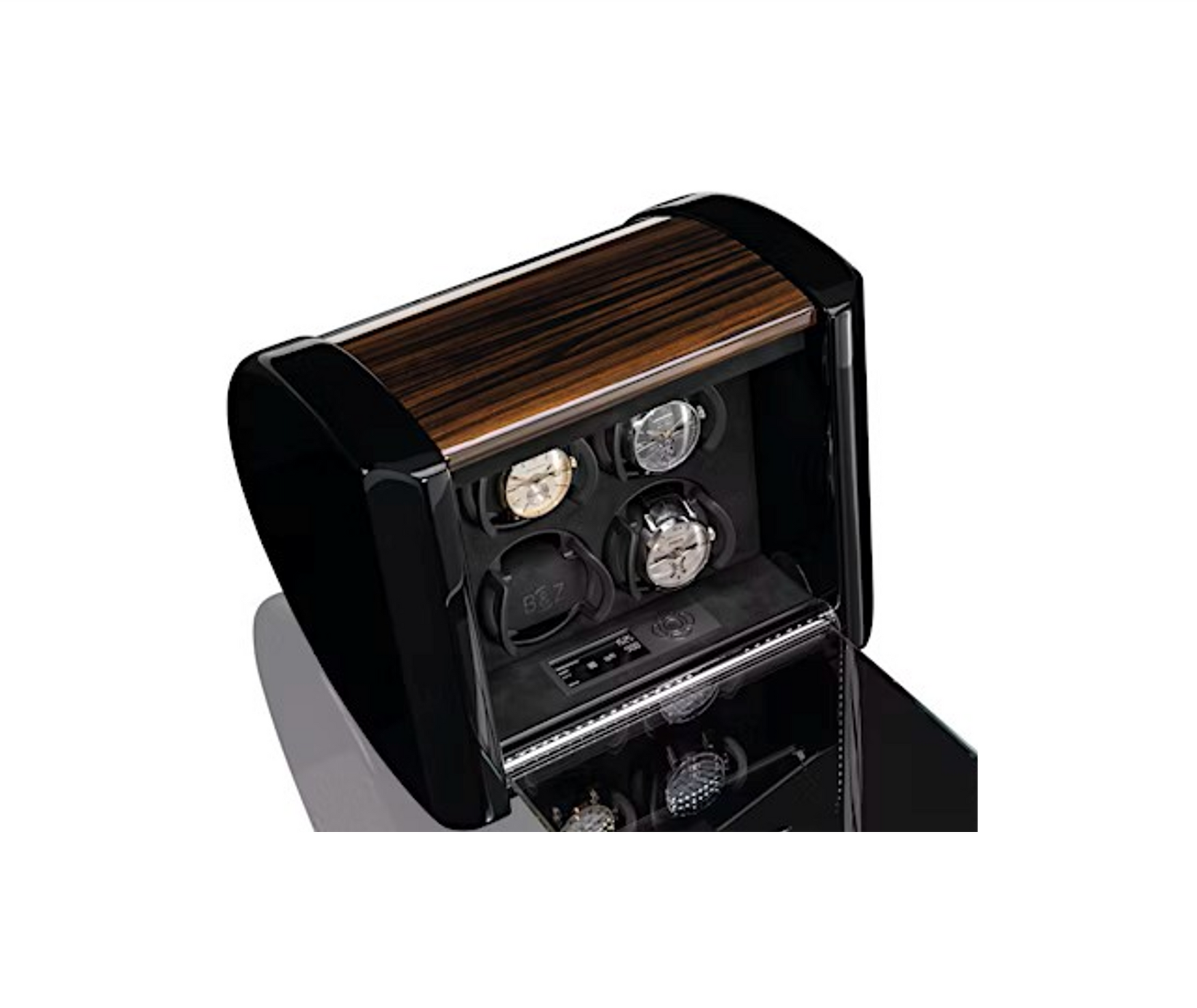 - Material: Exterior: Aluminum frame with Macassar wood inlays, finished in high-gloss piano lacquer; Front / Hood: Lockable security glass (crystal) with soft-close mechanism; Interior: Plush black velour lining, LED illumination with fading function; Cradles / Holders: Spring-loaded, push-button adjustable watch cradles to securely fit varied watch sizes