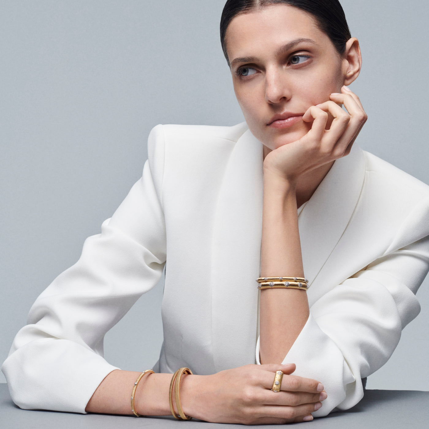 A refined ode to Buccellati’s engraving mastery, the Macri Classica Bracelet JAUBRA015165 shimmers with a soft, rigato-textured surface punctuated by diamond-set rosettes. The subtle wave of hand-engraved lines dances with light, while delicate gold beading adds depth and movement — a timeless piece that balances delicate detail with structural purity.
