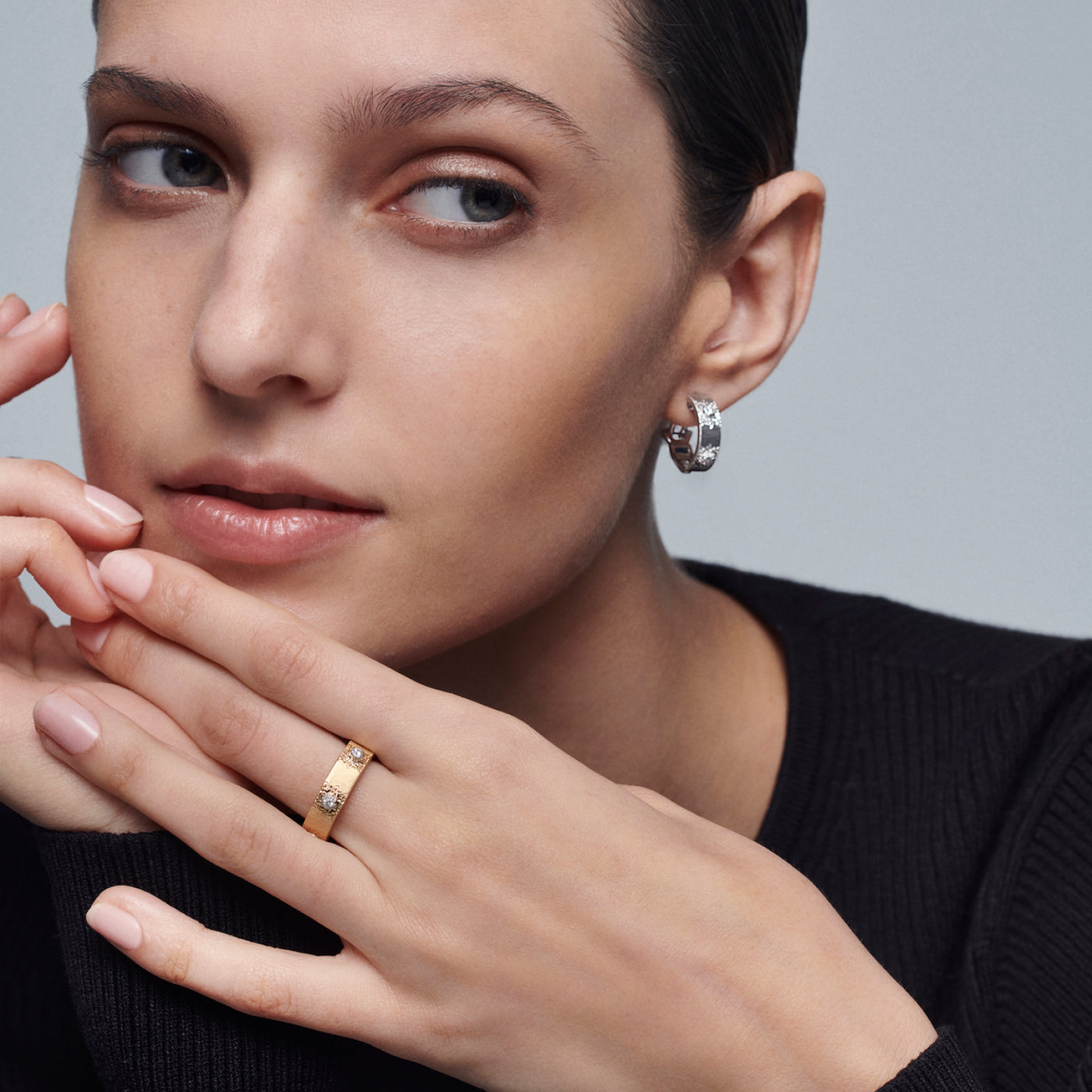 This ring exudes enduring elegance: the Macri Classica Eternelle balances sumptuous texture and radiant brilliance, with hand-engraved surfaces playing softly beneath scattered diamond rosettes. It’s a modern heirloom — a circle in which light and shadow dance, and in every angle the artistry reveals itself.