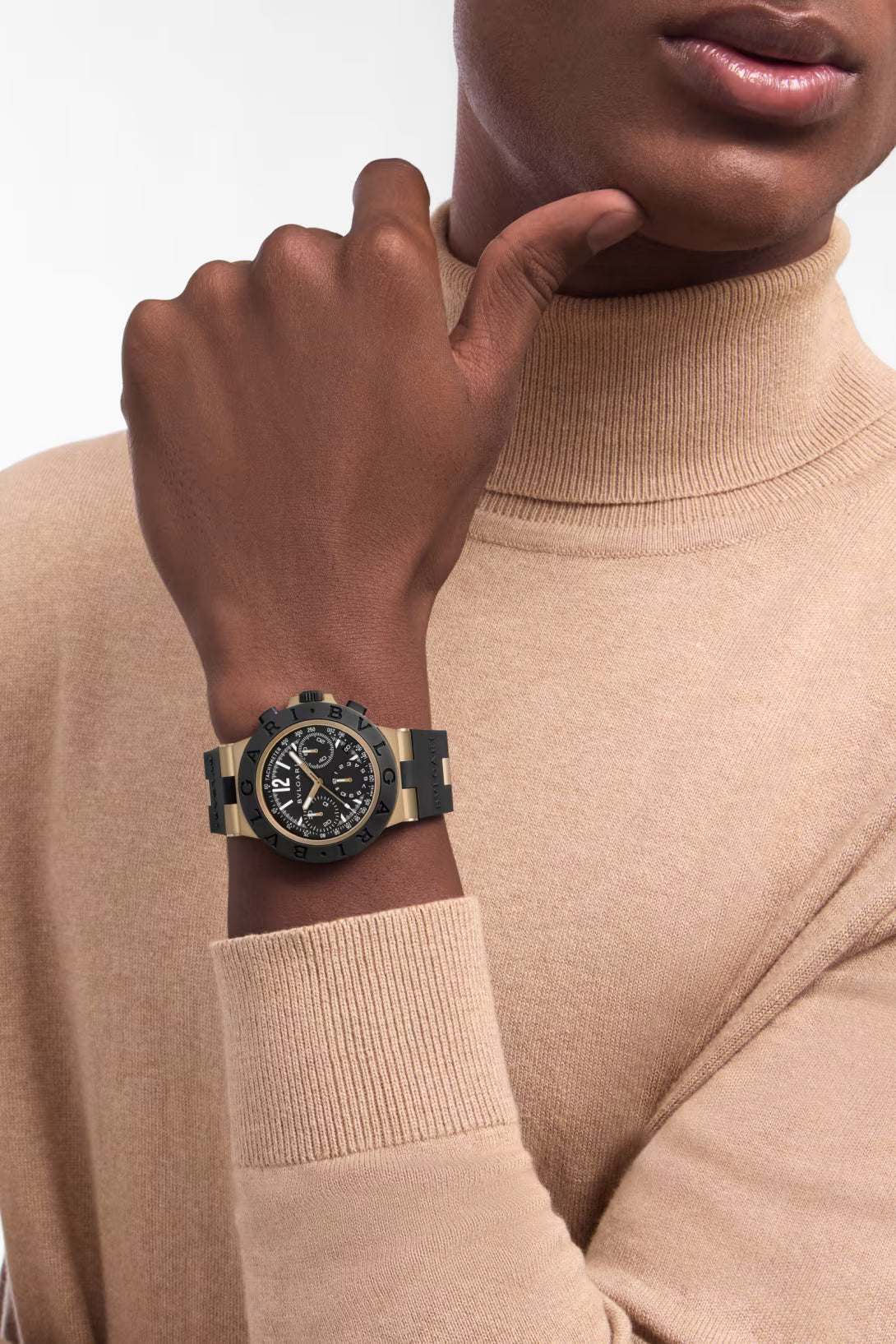 A bold and contemporary 41 mm chronograph crafted in sandblasted bronze, distinguished by a striking black rubber bezel engraved with the iconic BVLGARI lettering and paired with a matte black dial accented by vivid blue chronograph counters. Rose-gold-tone hands filled with luminous material ensure excellent legibility, while the sporty composition is enhanced by a date display and precise chronograph functionality. Powered by an automatic mechanical movement, this timepiece blends technical performance with a distinctive aesthetic and is completed with a black rubber strap featuring bronze elements—delivering a confident, modern interpretation of luxury sports watchmaking.
