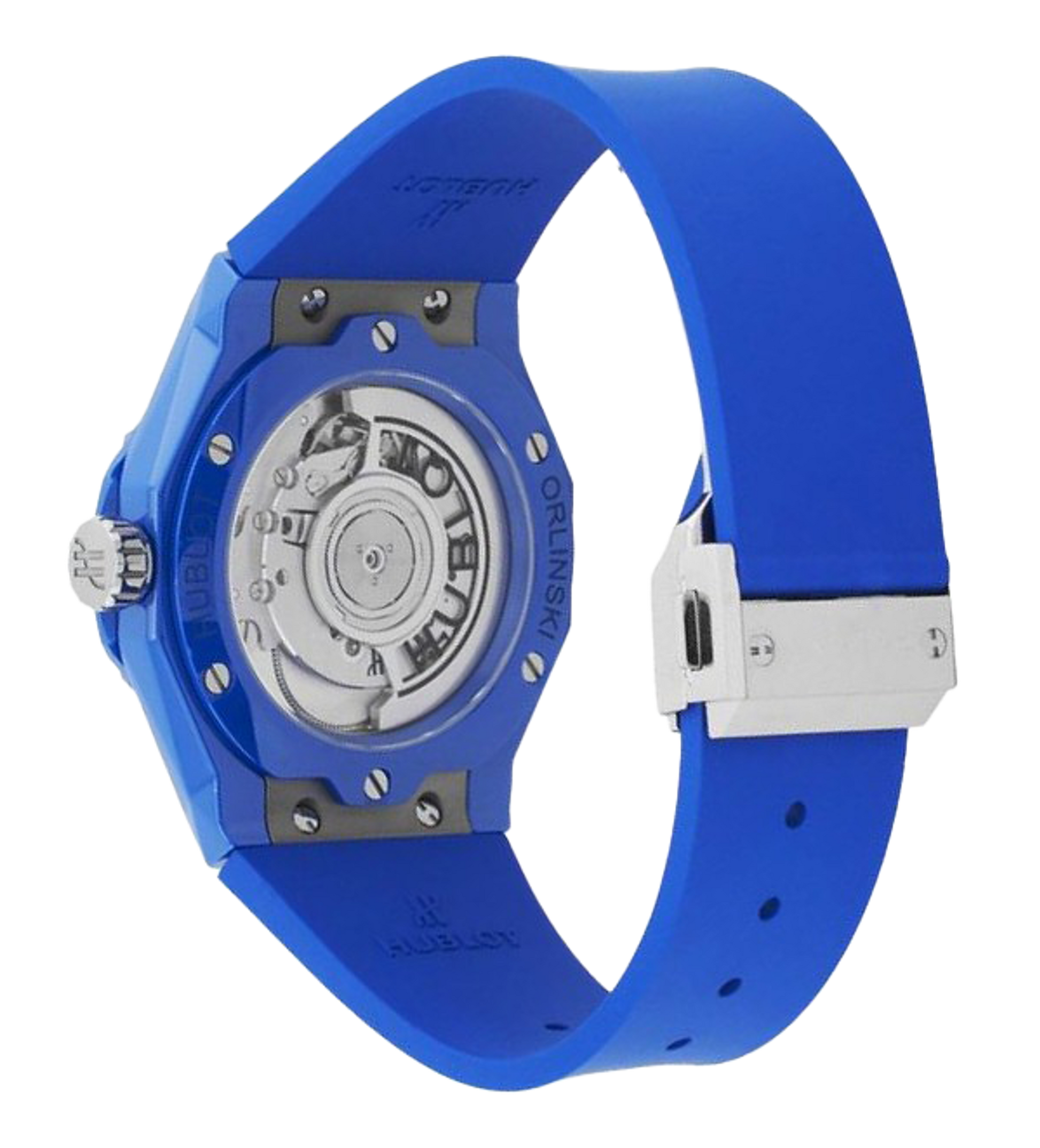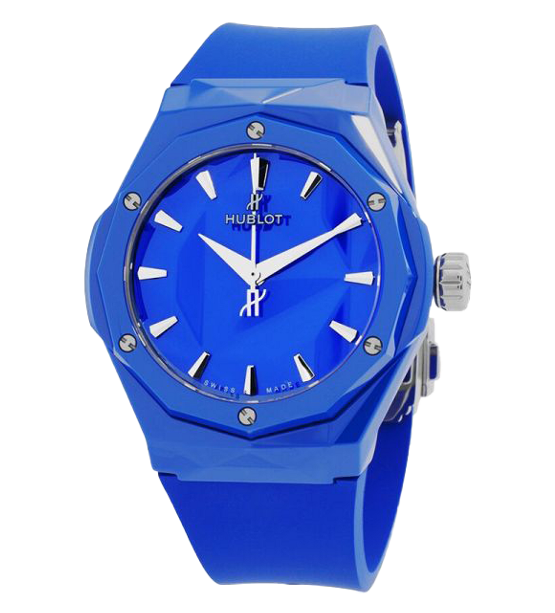 A striking and sculptural 40 mm automatic timepiece from the Classic Fusion Orlinski series that seamlessly blends contemporary art with refined Swiss watchmaking. The polished blue ceramic case and matching faceted blue ceramic dial reflect light across its angular surfaces, echoing the distinctive sculptural aesthetic of Richard Orlinski’s design language. Framed by a polished blue ceramic bezel secured with six H‑shaped black‑plated titanium screws, the dial features sleek hands and applied indexes for clear readability. Powered by a reliable self‑winding movement with a comfortable power reserve, this model is paired with a smooth blue rubber strap and a stainless‑steel deployant clasp—delivering a bold, modern expression of elegance and style.