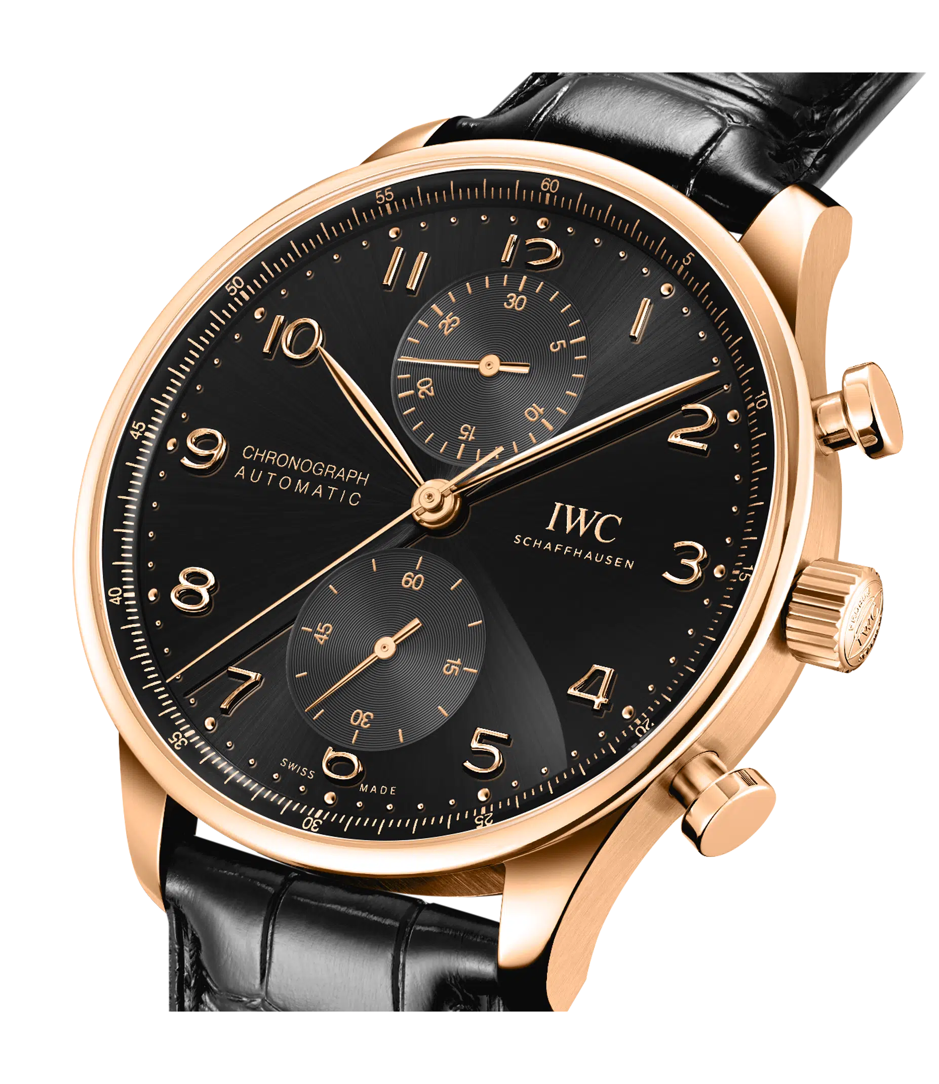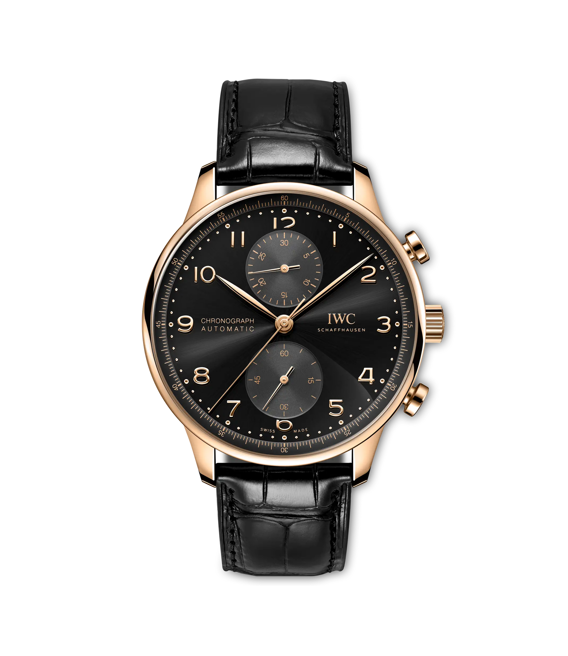 The Portugieser Chronograph IW371625 combines refined elegance with the technical precision of one of IWC Schaffhausen’s most iconic chronograph designs. Crafted in polished 18-carat 5N red gold, the 41 mm case frames a deep black dial that creates a striking contrast with gold-plated hands and appliqués. The characteristic Portugieser layout features vertically aligned subdials, placing the chronograph minutes at 12 o’clock and the small seconds at 6 o’clock for exceptional readability. A finely printed quarter-second scale on the inner flange allows highly precise time measurements while enhancing the watch’s distinctive aesthetic. Beneath the dial beats the IWC manufacture calibre 69355, an automatic chronograph movement engineered for durability, precision and everyday reliability, visible through the sapphire exhibition case back. Paired with a luxurious black Santoni alligator leather strap, this chronograph embodies the timeless balance of sporty functionality and classic Portugieser sophistication.