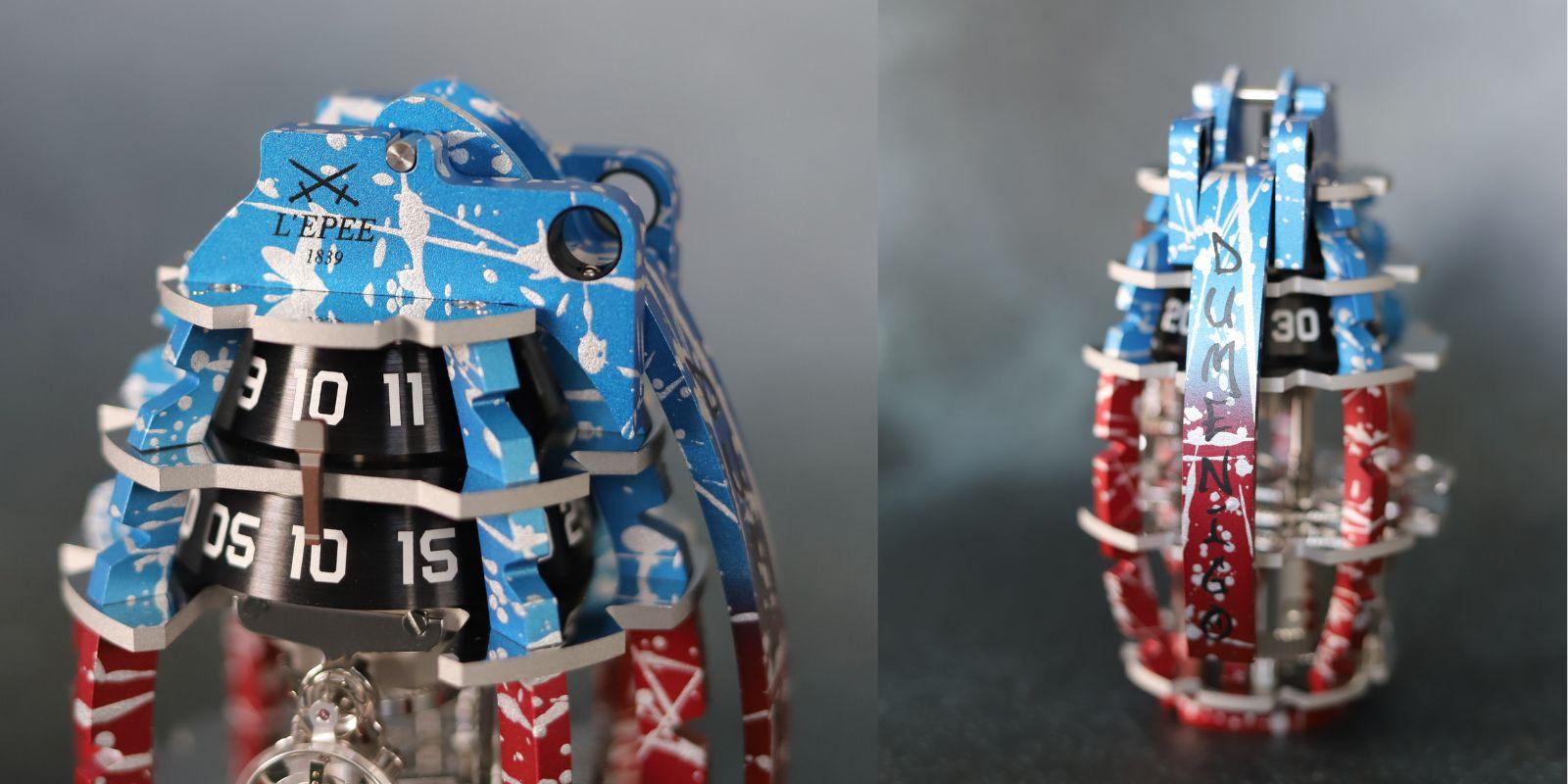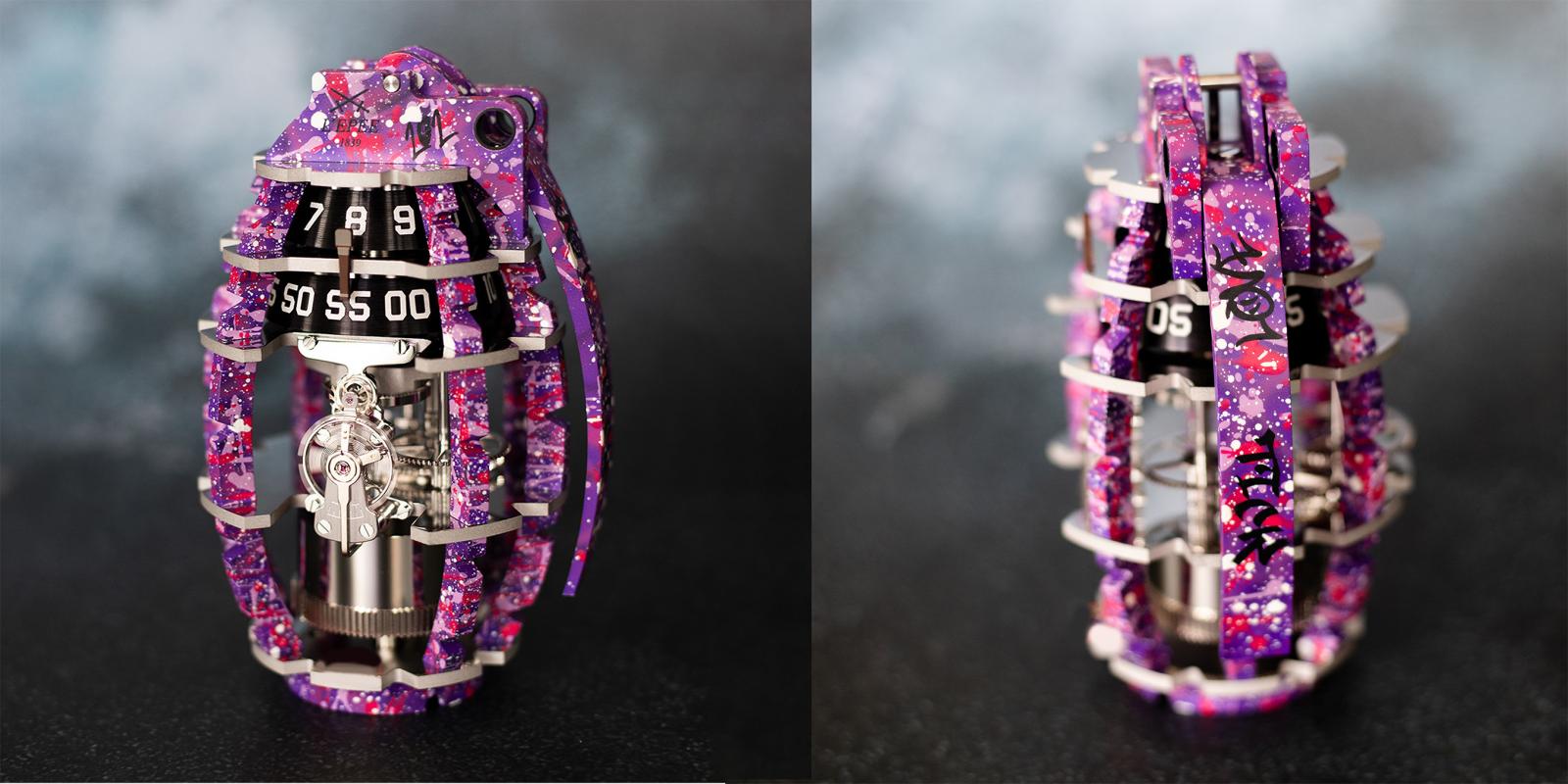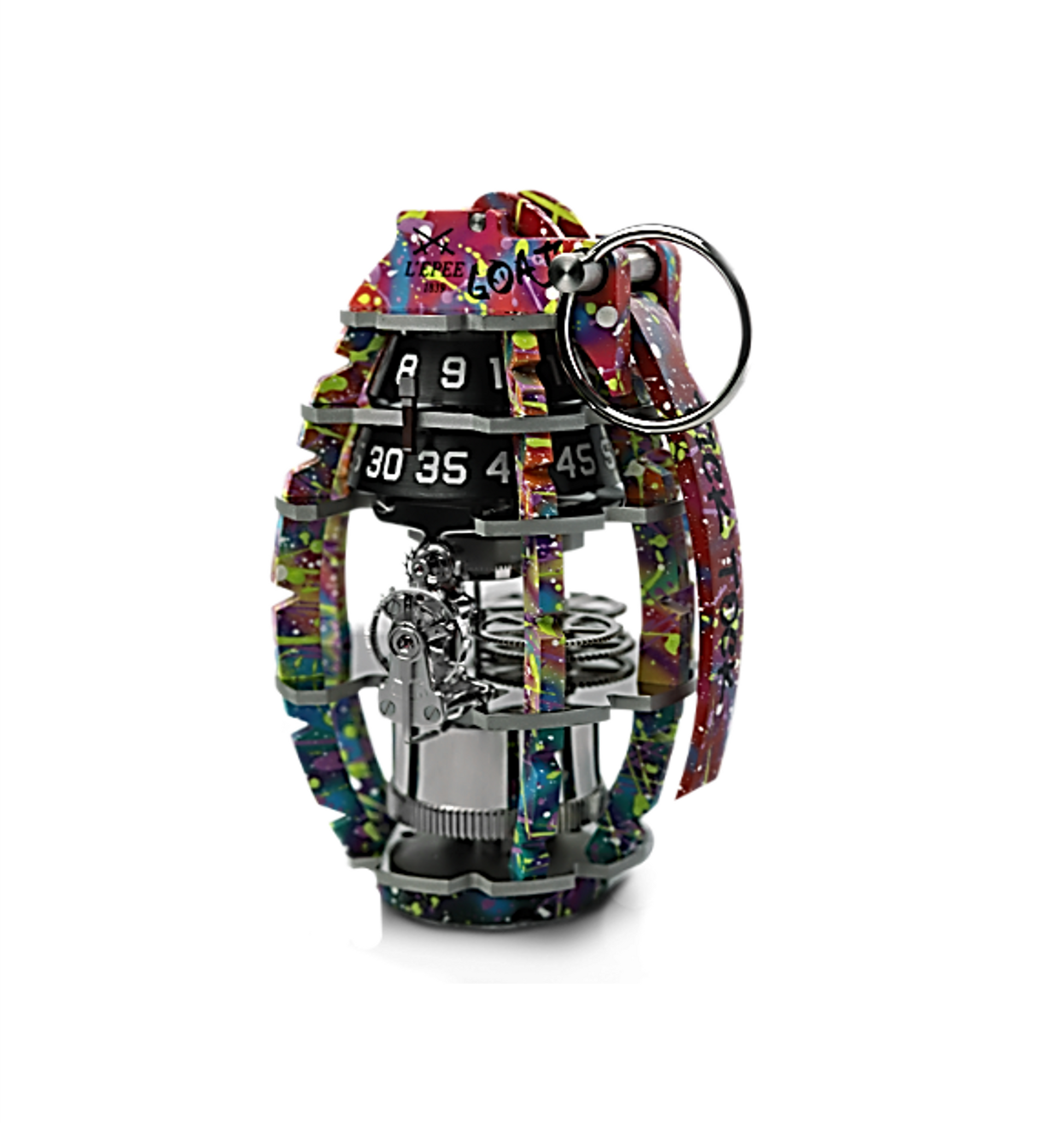 - Dial: A unique, hand-applied lacquered dial (The Dial Artist’s abstract bursts of colour and texture) — each piece is one-of-a-kind, treated as a small moving canvas within the mechanical grenade sculpture.