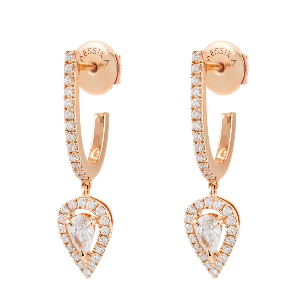 Radiant and refined, the Messika Joy Hoop Earrings 07480-RG from the Joy collection celebrate the timeless elegance of the pear-cut diamond. Crafted in 18K rose gold, each earring features a central pear-cut diamond weighing 0.10 carat, surrounded by a full circle of pavé diamonds that hug the earlobe, creating both subtlety and impact with every turn. With a total diamond weight of 0.41 carat (F/VS quality), these earrings balance luminous elegance and versatility — perfect for elevating both daytime looks and evening ensembles.