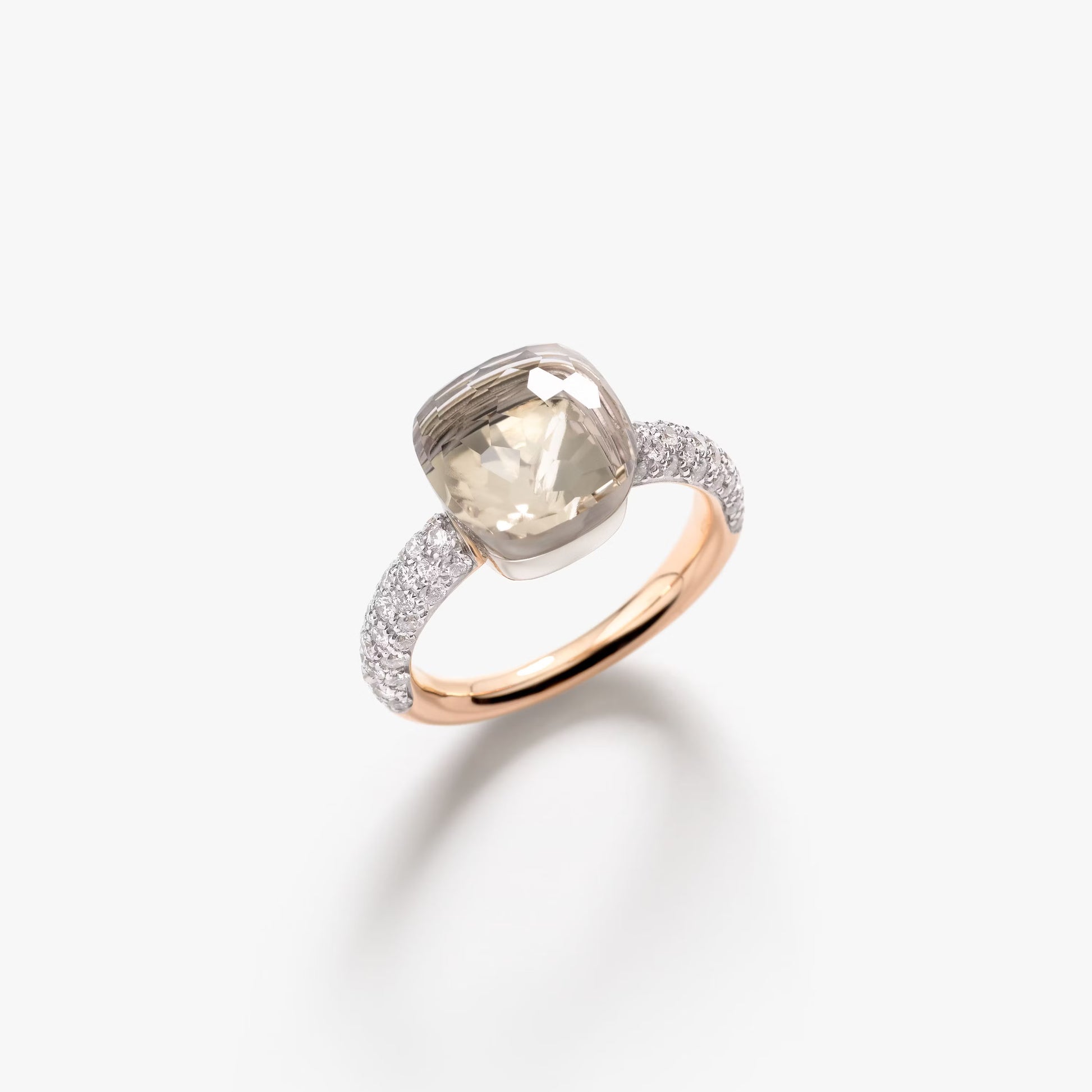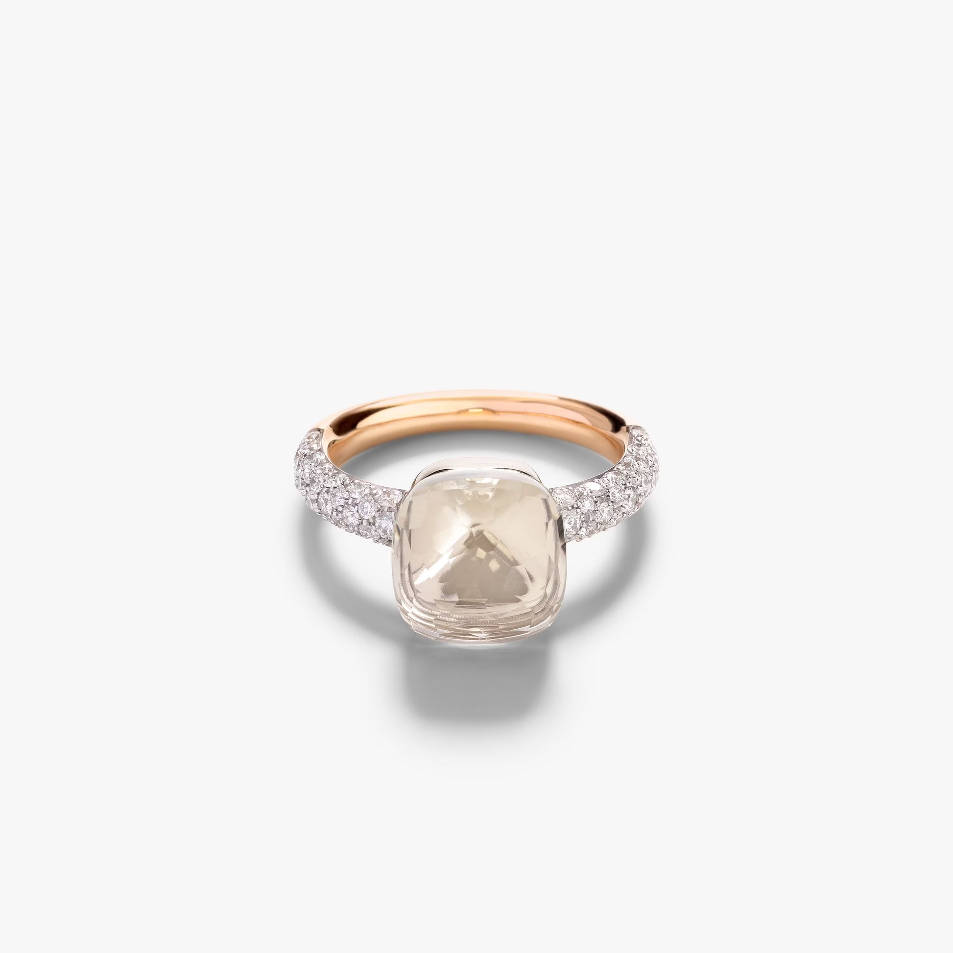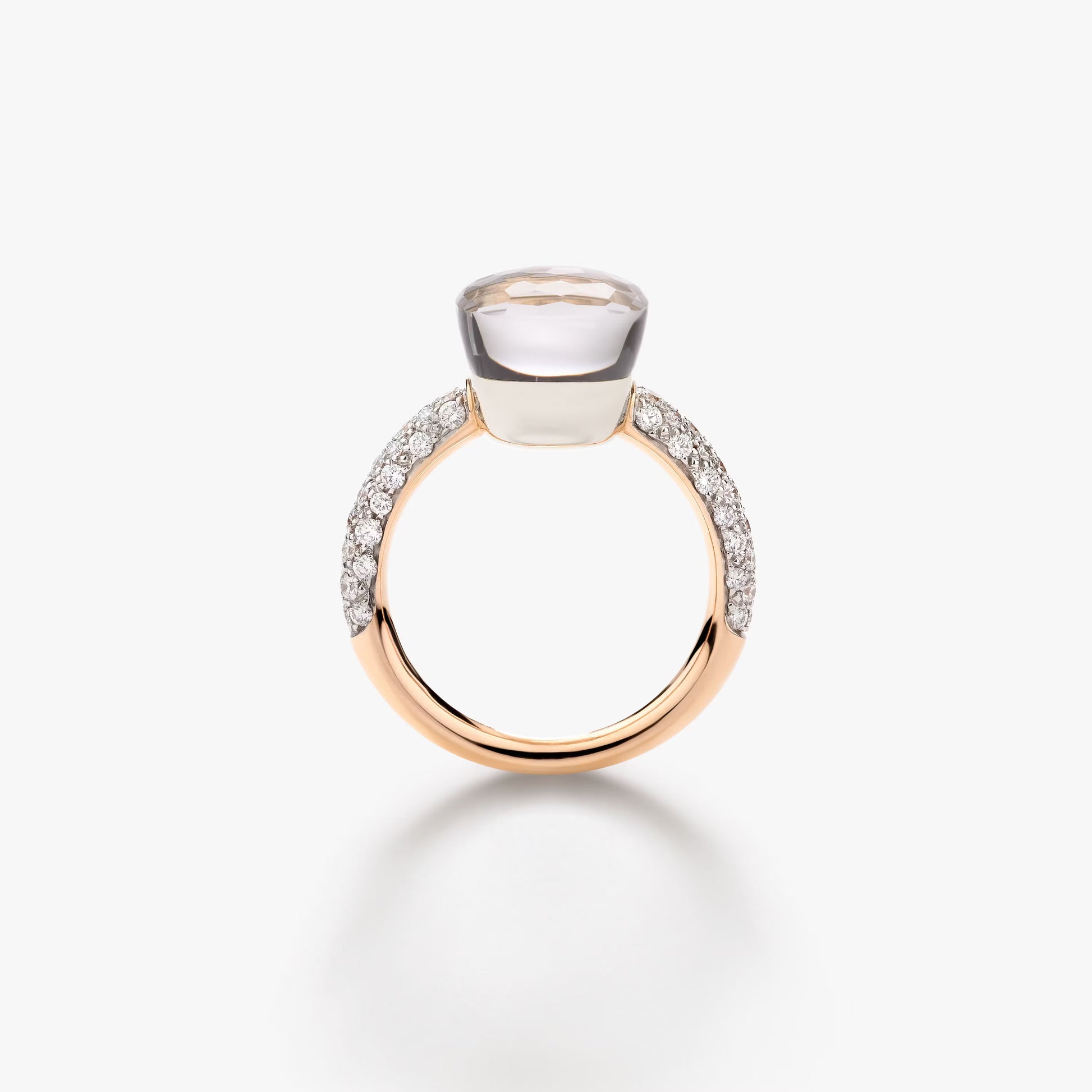 A timeless embodiment of Pomellato's iconic design, the Nudo Classic Ring in Rose and White Gold showcases the brand's commitment to elegance and innovation. Crafted in 18-karat rose and white gold, this ring features a white topaz (approximately 9 carats) at its center, surrounded by 58 white diamonds (approximately 0.70 carats). The absence of prongs allows the gemstone to appear as though it is floating, emphasizing its natural beauty. The ring's clean lines and minimalist design make it a versatile piece, suitable for both everyday wear and special occasions.