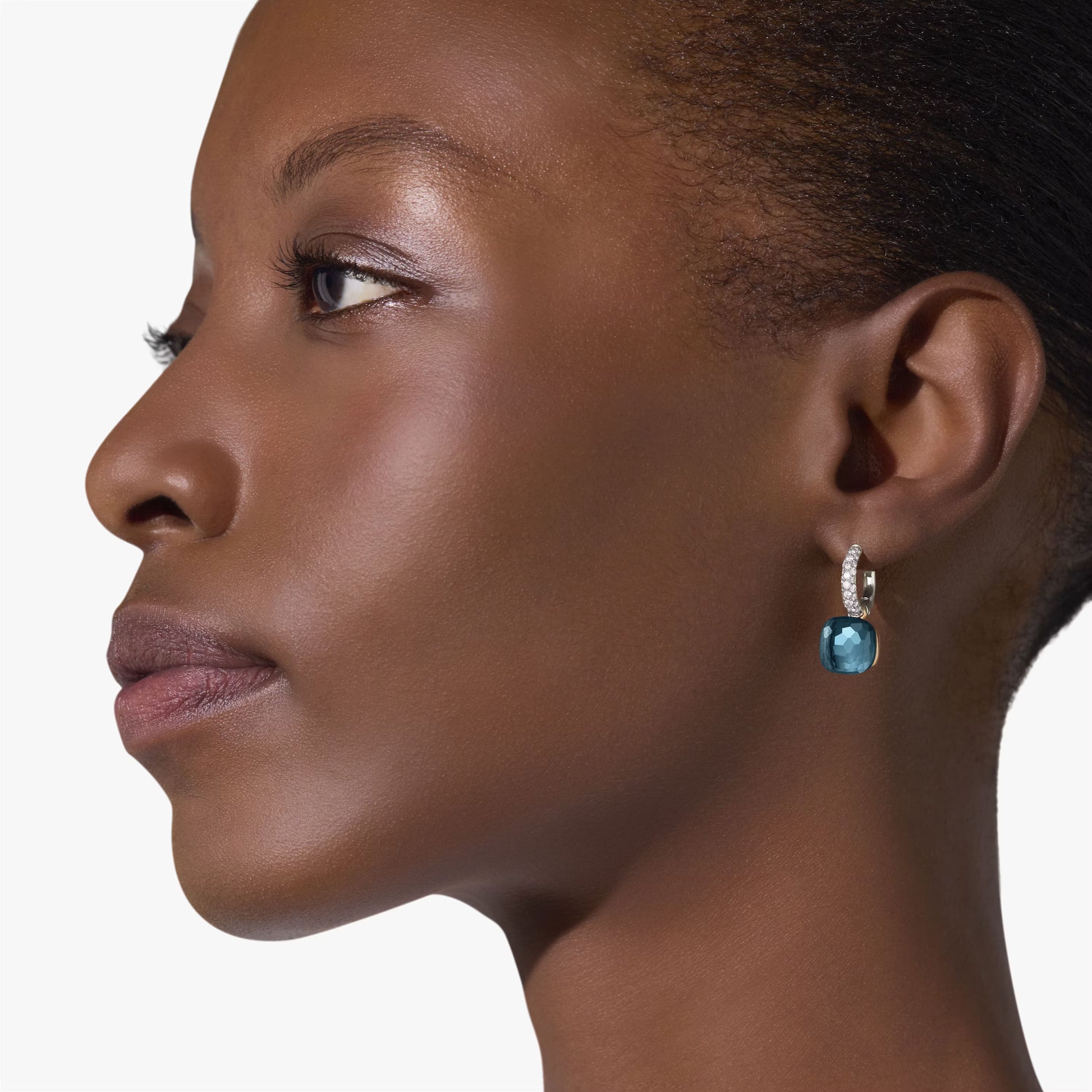 Earrings in 18K rhodium-plated white and rose gold featuring 2 London Blue Topazes (≈18 ct) and 56 brilliant white diamonds (≈0.5 ct) set on white rhodium-plated 18K white gold. The precious version of the house's legendary ring is expressed in this opulent pair of earrings, which showcases a 'Nudo' stone in a captivating color and a diamond-encrusted clasp for added sparkle and glamour. A contemporary yet timeless design, perfect for elevating both everyday ensembles and special occasions.