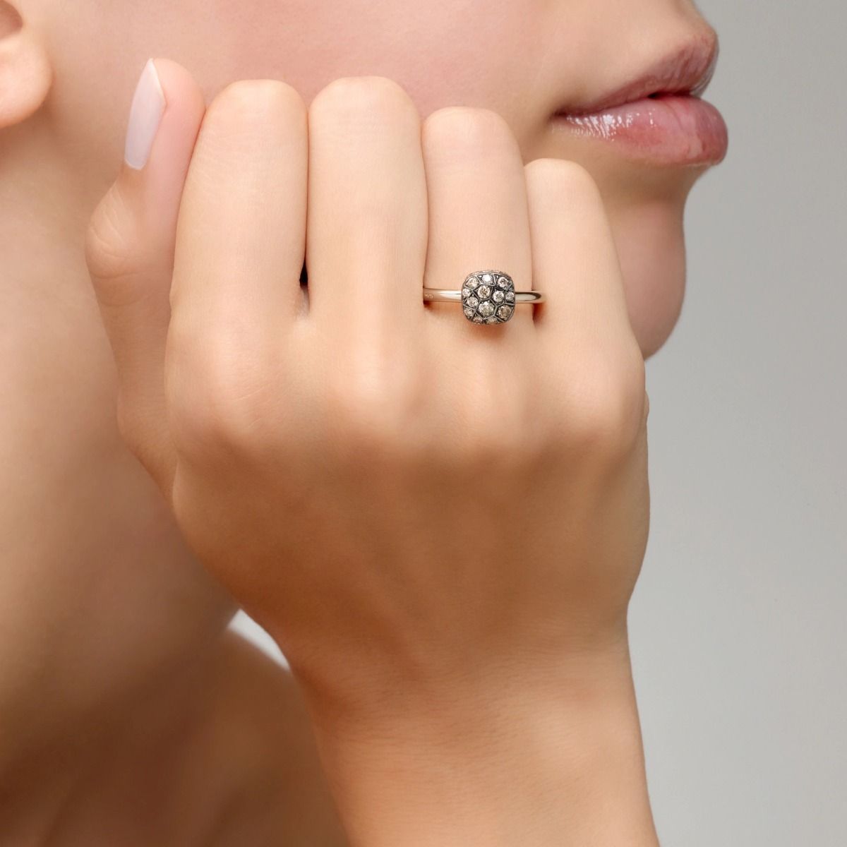 A luminous harmony of contrast and refinement, the Nudo Solitaire Ring in Rose and White Gold captures the essence of bold understatement. Cast in 18K rose gold complemented by rhodium-plated white gold accents, this ring features a trail of pavé brown diamonds (approx. 0.85 ct) that elegantly cascade along one side of the band, lending movement and depth to its architecture. The central gem is given space to shine, set with Pomellato’s signature prong-free approach so that light flows freely around it. The contrast between the warm rose gold and the glinting brown diamonds yields a sophisticated interplay of tone. Polished and sculptural, the ring offers both presence and wearability, ideal for those who favor jewelry that speaks in subtle luxury.
