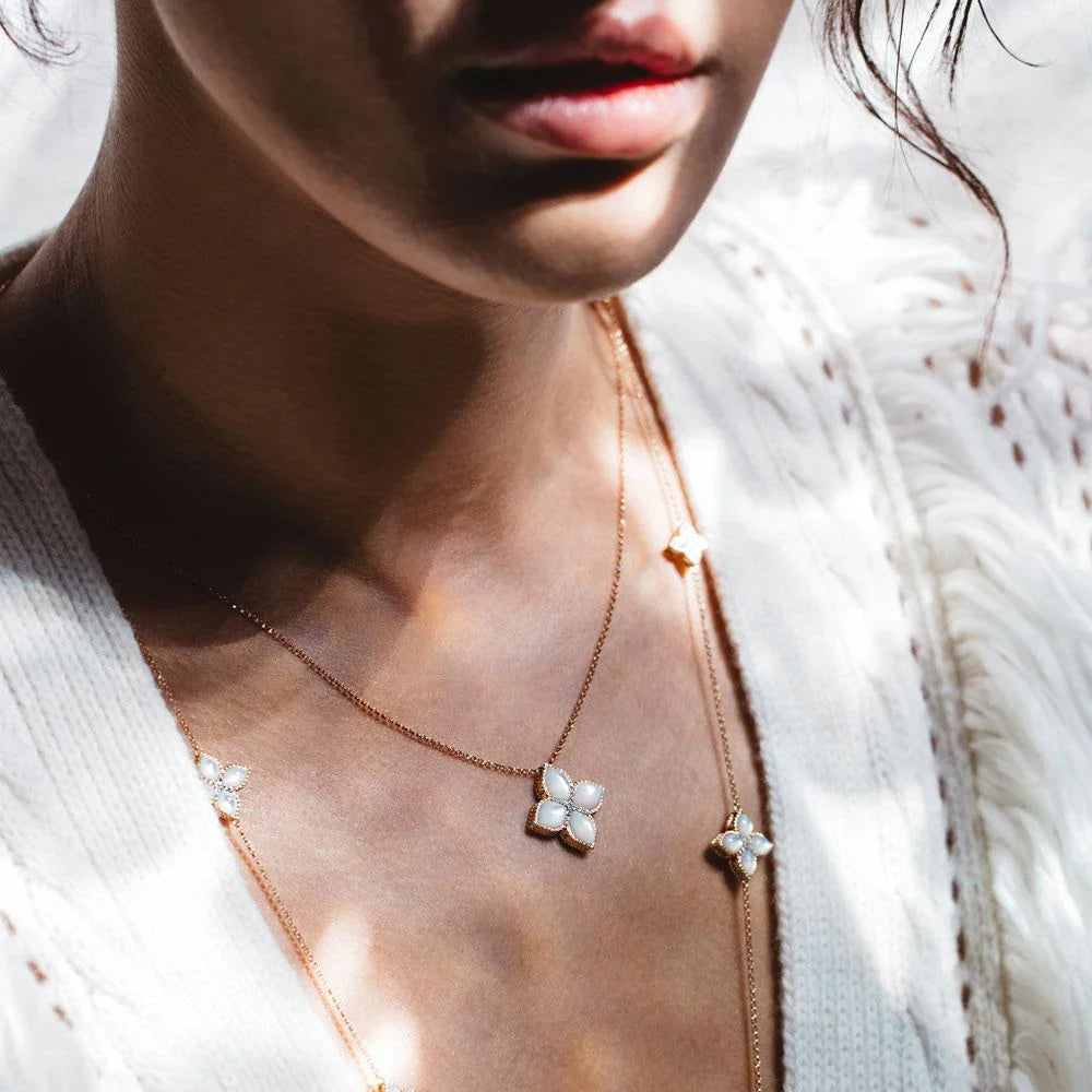 A poetic bloom suspended from light, this pendant transforms the classic flower motif into a luminous treasure. Cast in warm 18 kt rose gold, its petal edges are traced with pavé diamonds for delicate brilliance, while the heart is a radiant mother-of-pearl disc that seems to glow from within. The gentle contrast between the iridescent pearl and sparkling diamond rim evokes a dewy blossom at dawn. Suspended from a fine chain, its floating silhouette flatters the décolleté, and a hidden ruby under the petals affirms the signature Roberto Coin “secret gem” tradition.