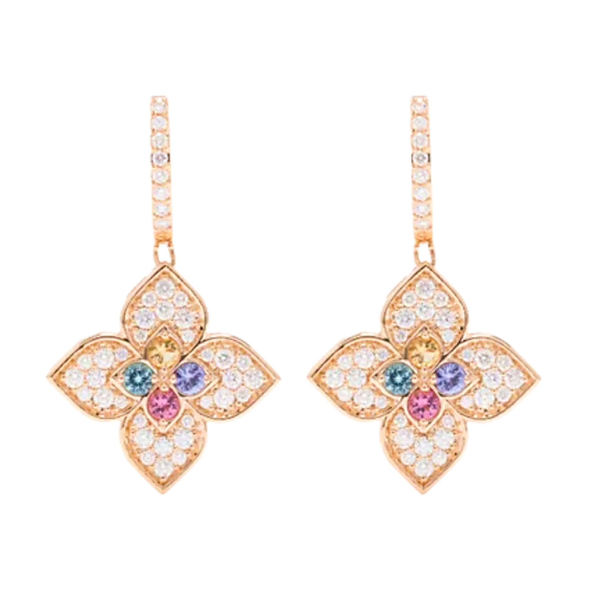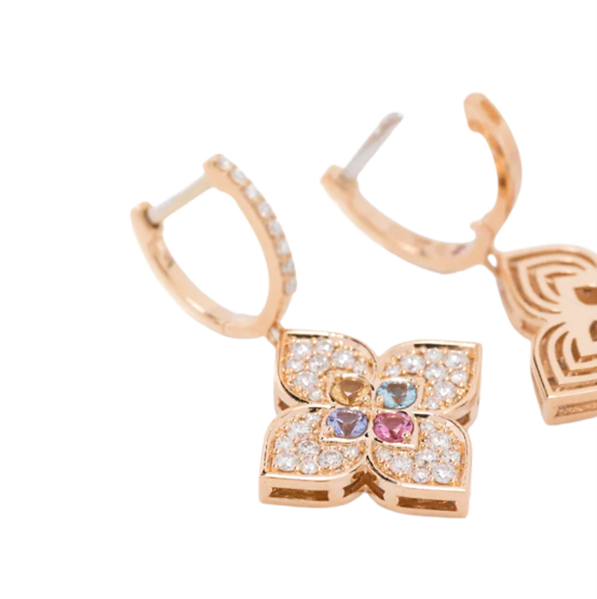An exquisite celebration of bloom and brilliance, this elegant stud earring from the Roberto Coin “Venetian Princess” collection embodies refined femininity. Crafted in lustrous 18-karat rose gold, its polished petals unfurl in a compact floral motif, each petal gently curved to catch light. The centre is warmed by pavé-set diamonds, while the surrounding petals are gently kissed by colorful sapphires — pink, yellow and blue — adding a joyful multi-hue accent. The secure butterfly-clasp finishing underlines its understated luxury, made wholly in Italy with artisan attention to detail. A subtle signature ruby—true to Roberto Coin’s “secret gem” tradition—rests discreetly on the underside, giving a hidden wink of exclusivity when worn.