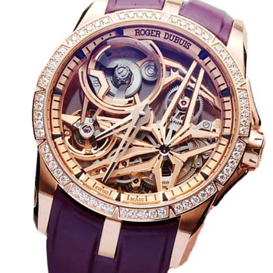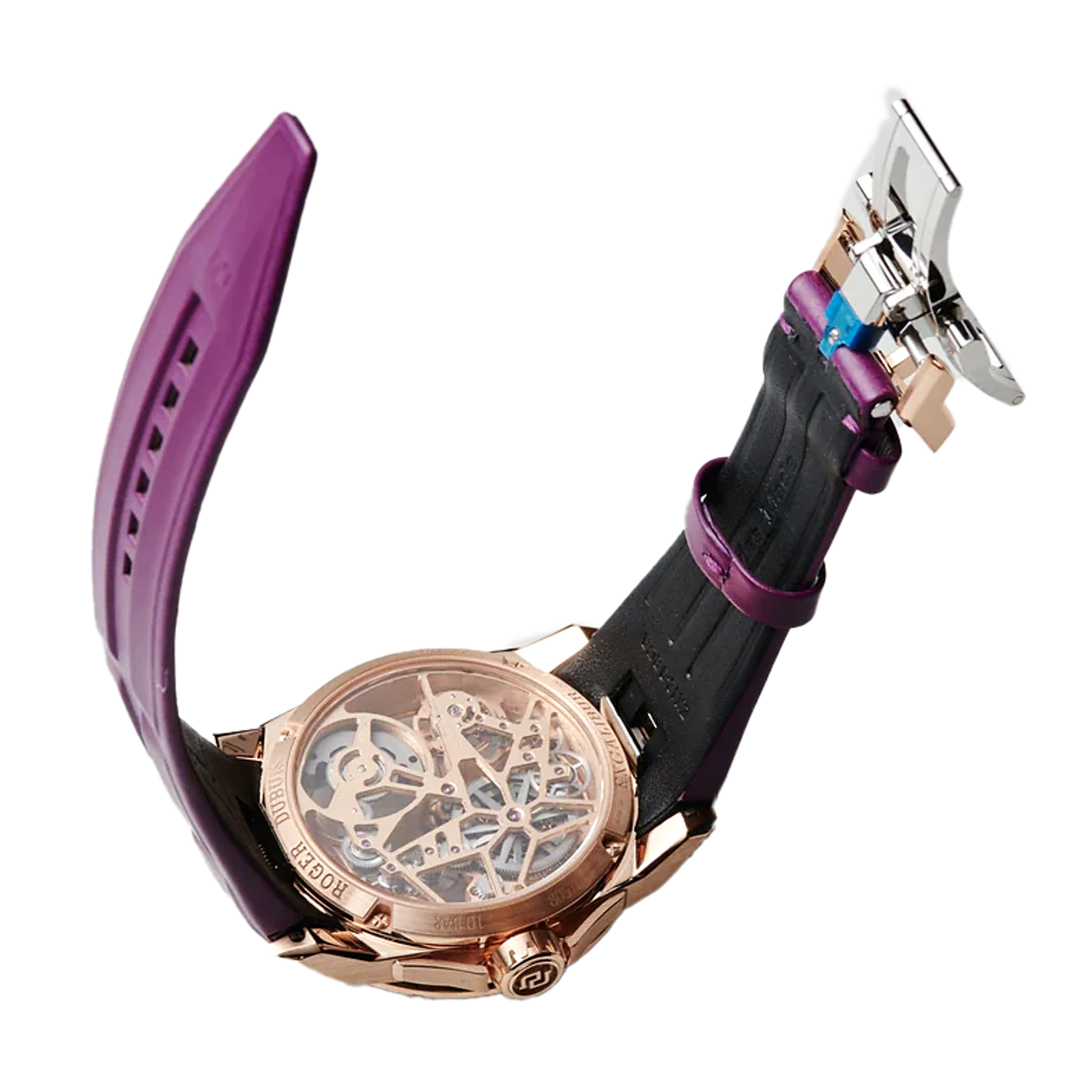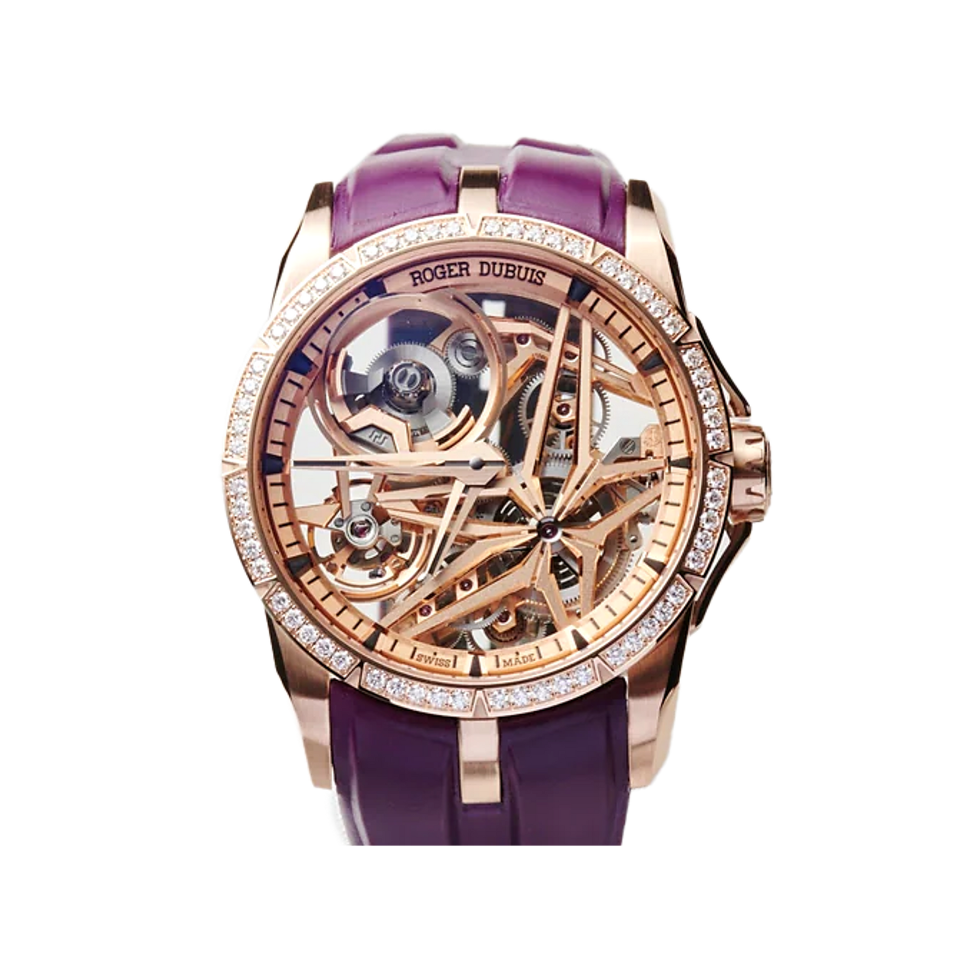 A radiant interpretation of the iconic Excalibur design, this 42 mm timepiece blends the architectural skeleton aesthetic of Roger Dubuis with the brilliance of a diamond-set bezel. The warm glow of the rose-gold case contrasts beautifully with the openworked dial, revealing the mechanical artistry within while maintaining the bold, sculptural identity of the Excalibur collection. Completed with a sporty rubber strap, the watch balances haute-horlogerie craftsmanship with contemporary elegance.