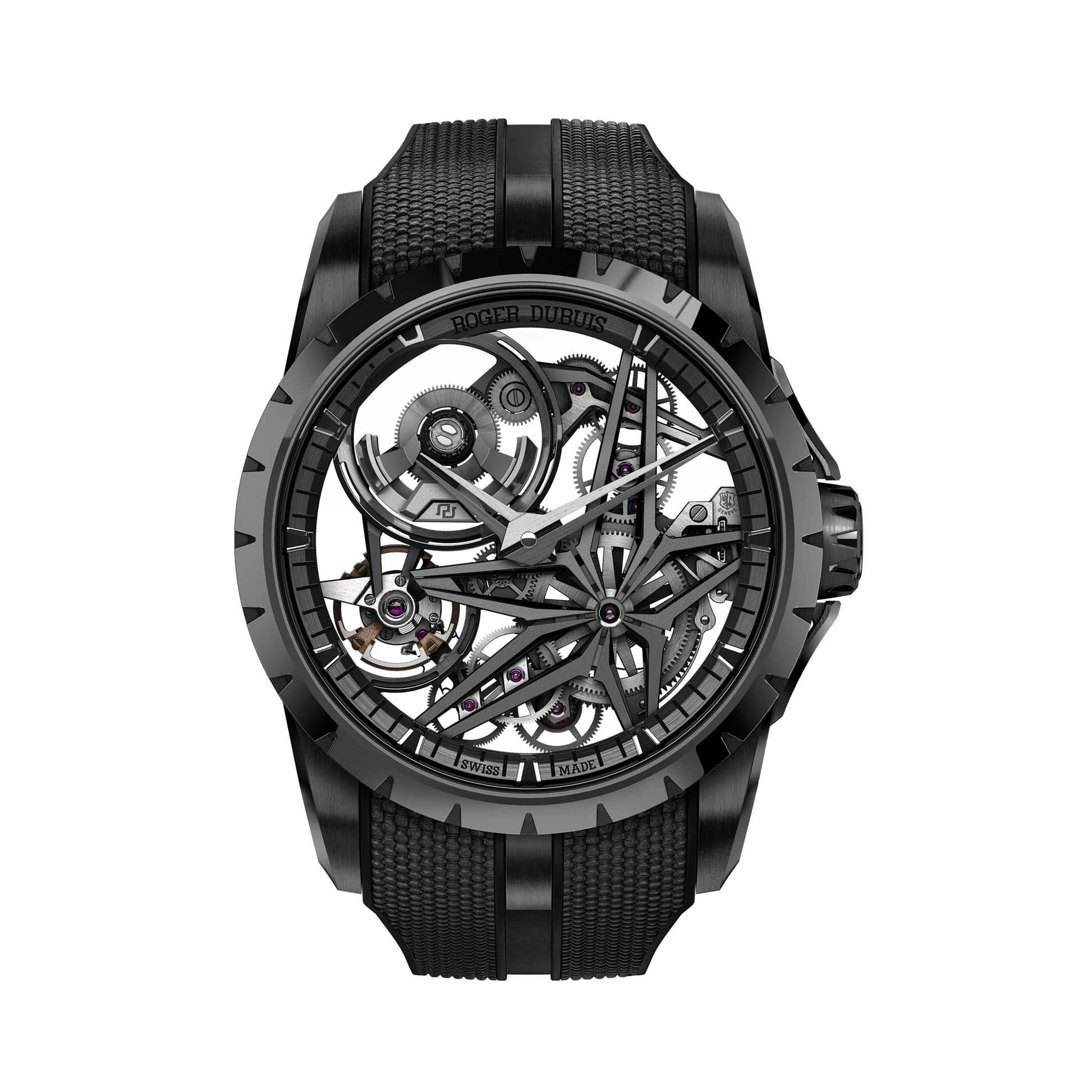 A contemporary expression of avant-garde watchmaking, the Excalibur Monobalancier Titanium highlights the signature skeleton architecture that defines the bold identity of Roger Dubuis. The 42 mm case in black DLC-coated titanium delivers a powerful yet lightweight presence, while the openworked dial reveals the refined mechanics of the manufacture calibre within. Certified by the prestigious Poinçon de Genève and engineered for enhanced performance, the movement offers exceptional finishing, precision, and a robust 72-hour power reserve—perfectly complemented by a sporty rubber strap.