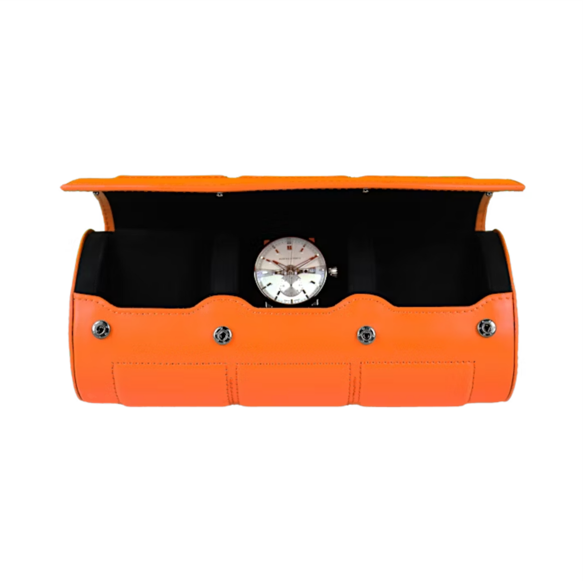 The Buben & Zorweg Nitro 3 Leather Orange embodies refined German craftsmanship and sleek modern design. Created for discerning watch enthusiasts, this elegant travel and storage case merges luxurious materials with precise functionality. Its supple, hand-stitched leather exterior and velvety interior ensure your timepieces are protected in style, while the structured form and polished silver details highlight its timeless sophistication — the perfect companion for both travel and display.