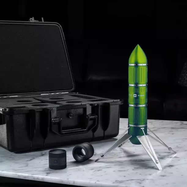 A playful and imaginative desk accessory that merges mechanical sophistication with a space‑inspired design narrative. Conceived as a modular rocket‑shaped magnification station, this co‑creation by MB&F and Loupe System enables collectors to view intricate watch movement details via high‑quality optical loupes while serving as a whimsical desk sculpture. The robust anodized aluminium and stainless‑steel construction houses multiple storage stages for loupes and glows subtly from a tritium capsule “booster,” recalling classic cosmic adventures. Limited to a collectible run in green, the set includes premium loupes and accessories that elevate both function and display.