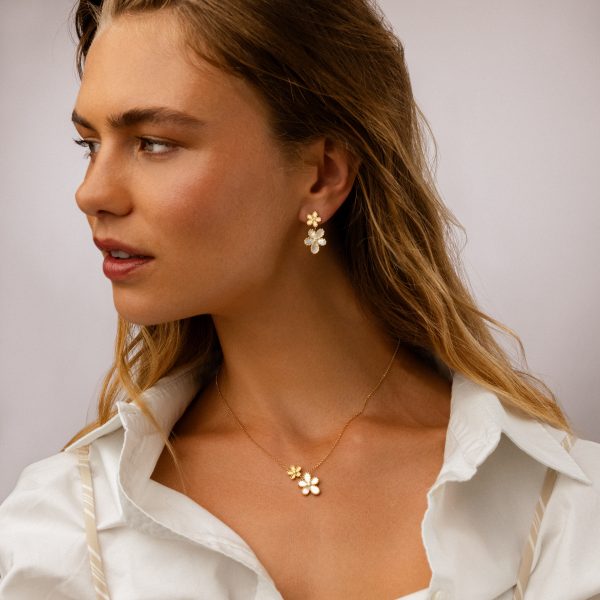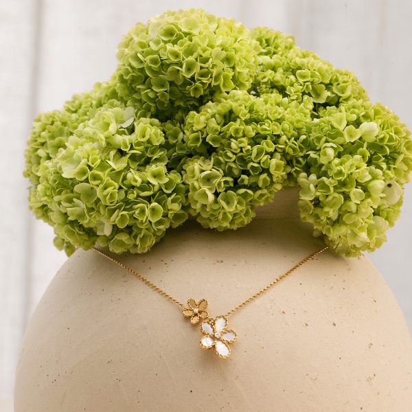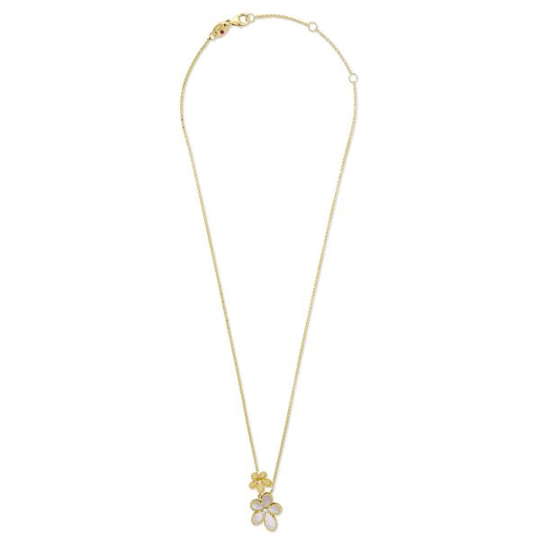 – White diamonds: total weight approx. 0.055 ct, G color, VS clarity, round brilliant cut - Design: Jasmine floral motif necklace with mother-of-pearl centerpiece and pavé-set diamond accents; polished yellow gold finish; handcrafted Italian craftsmanship with signature hidden ruby