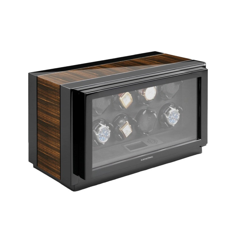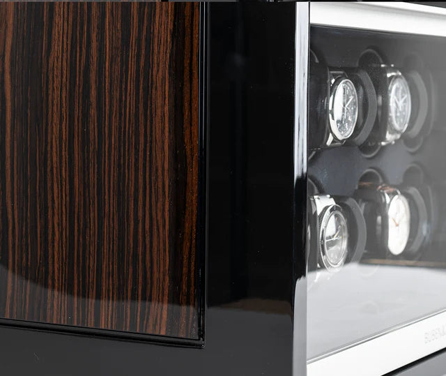 The NEO 8 Macassar is a refined showcase of minimalist luxury and technological intimacy — its two-piece architecture balancing strength and transparency, its lockable glass door offering both protection and display. With LED fade lighting and plush interiors, it presents your collection of eight automatic timepieces as both art and companion. The NEO’s clear geometry and elegant Macassar wood inlays articulate a confident presence that fits seamlessly into refined interiors.