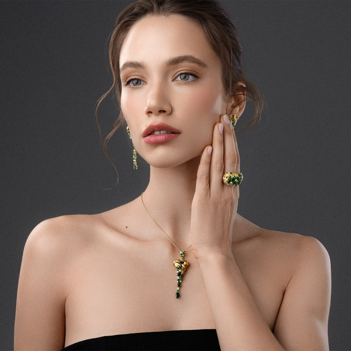 A sculptural masterpiece, the Earth 2158.1 pendant by Carrera y Carrera embodies the raw beauty of nature. Crafted in 18 KT yellow gold, it features a harmonious arrangement of diamonds and diopsides, creating a radiant interplay of light and color. The pendant's design evokes the organic forms of the earth, offering a bold statement of elegance and strength. Suspended from a fine chain, this piece captures the essence of natural beauty and refined craftsmanship.