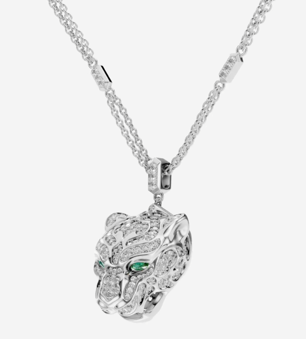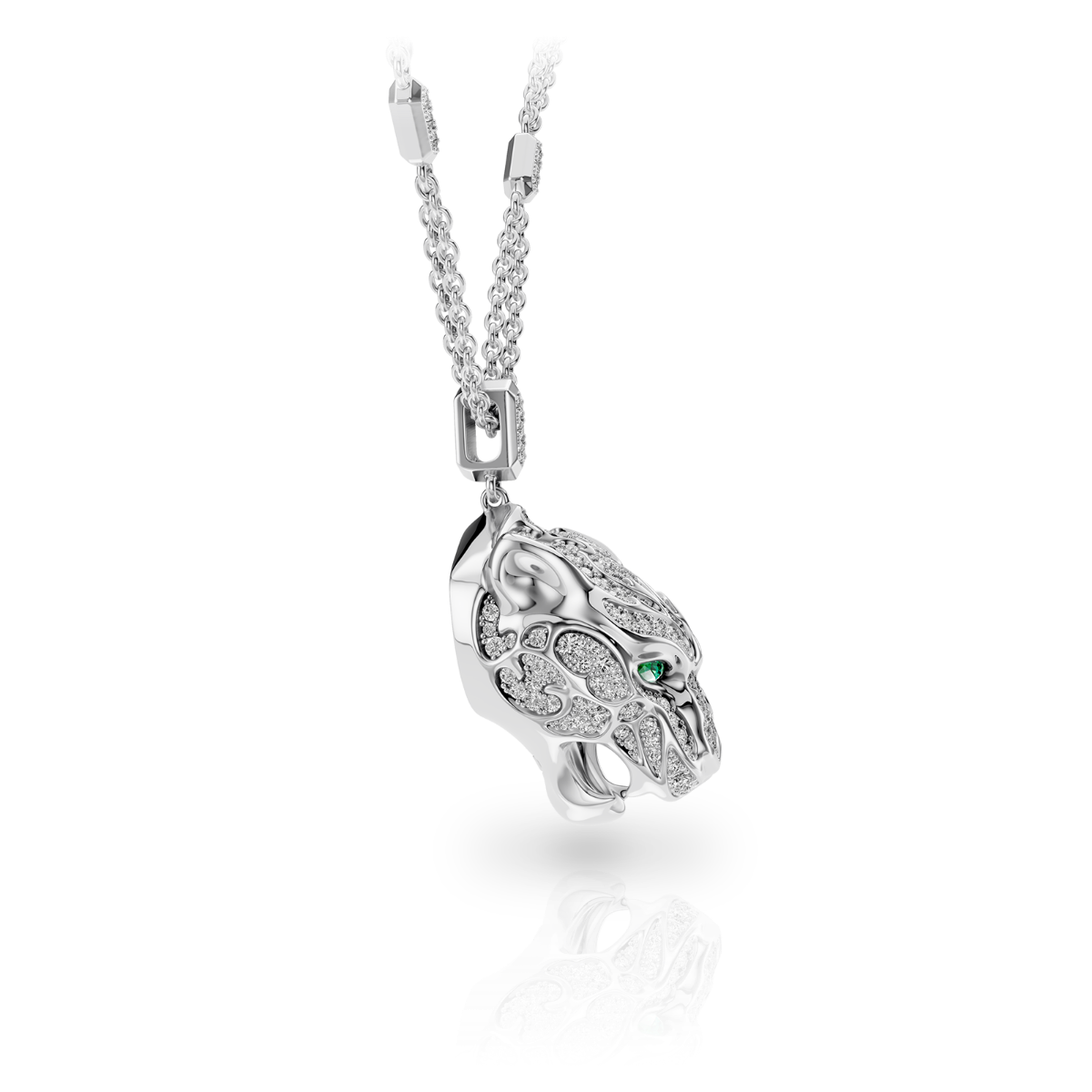 A modern icon of elegance, the Zodaria Pavé 0025.2 pendant from Carrera y Carrera is crafted in 18 KT white gold and lavishly set with pavé diamonds and vivid emeralds. Its refined drop silhouette embodies sculptural sophistication, while the luminous gemstones create a captivating play of light. Suspended on a slender white-gold chain, it transitions effortlessly from day to evening with timeless grace.