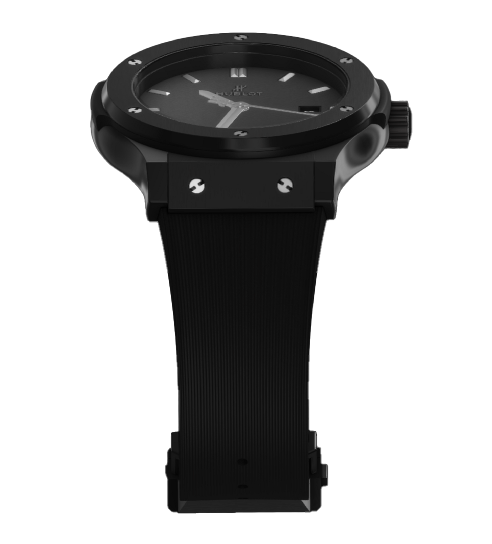 A stealthy 42 mm Classic Fusion rendered entirely in polished and satin‑finished black high‑tech ceramic, featuring a minimalist matte‑black dial and matching black lined rubber strap—merging refined elegance with modern materials. Powered by Hublot’s HUB1110 in-house self‑winding movement, the watch delivers a 42‑hour power reserve and offers 50 m water resistance.
