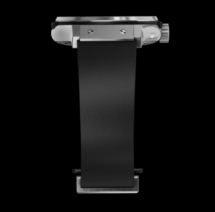 - Strap: Smooth black rubber strap — supple, durable, and water-resistant — ensuring a comfortable fit and subtly sporty character that perfectly complements the titanium case.