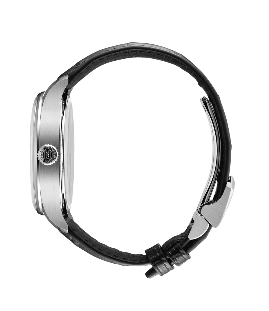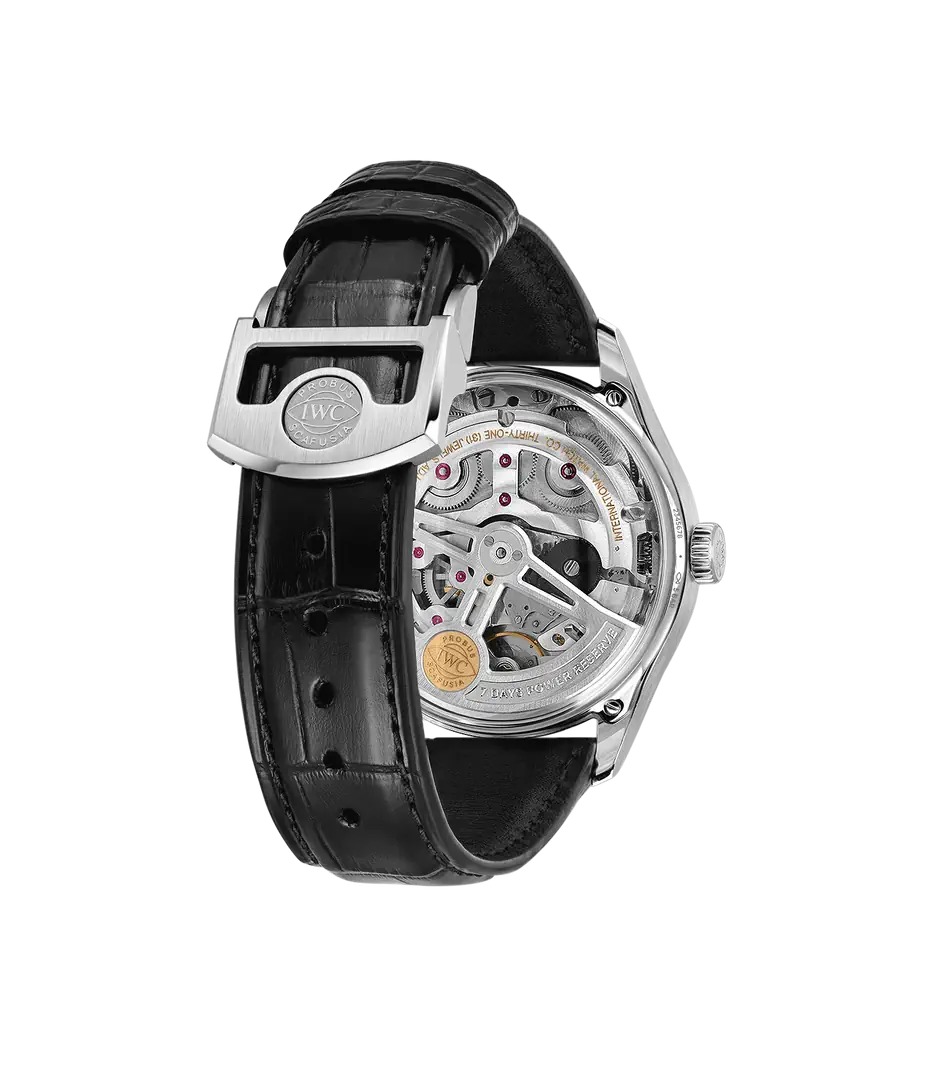 A commanding 42.3 mm Portugieser Automatic crafted in stainless steel, showcasing a silver-plated dial with applied Arabic numerals and rhodium-plated feuille hands, encircled by a delicate minutes track that evokes the timeless spirit of marine navigation. A subdial duo at 3 and 9 o’clock elegantly balances the composition, while the transparent sapphire case back reveals the refined IWC-manufactured calibre 52011—equipped with the Pellaton automatic winding system, twin barrels, and an impressive 7-day power reserve. Completed by a black alligator leather strap and folding clasp, this timepiece embodies the harmony of precision engineering and enduring sophistication.