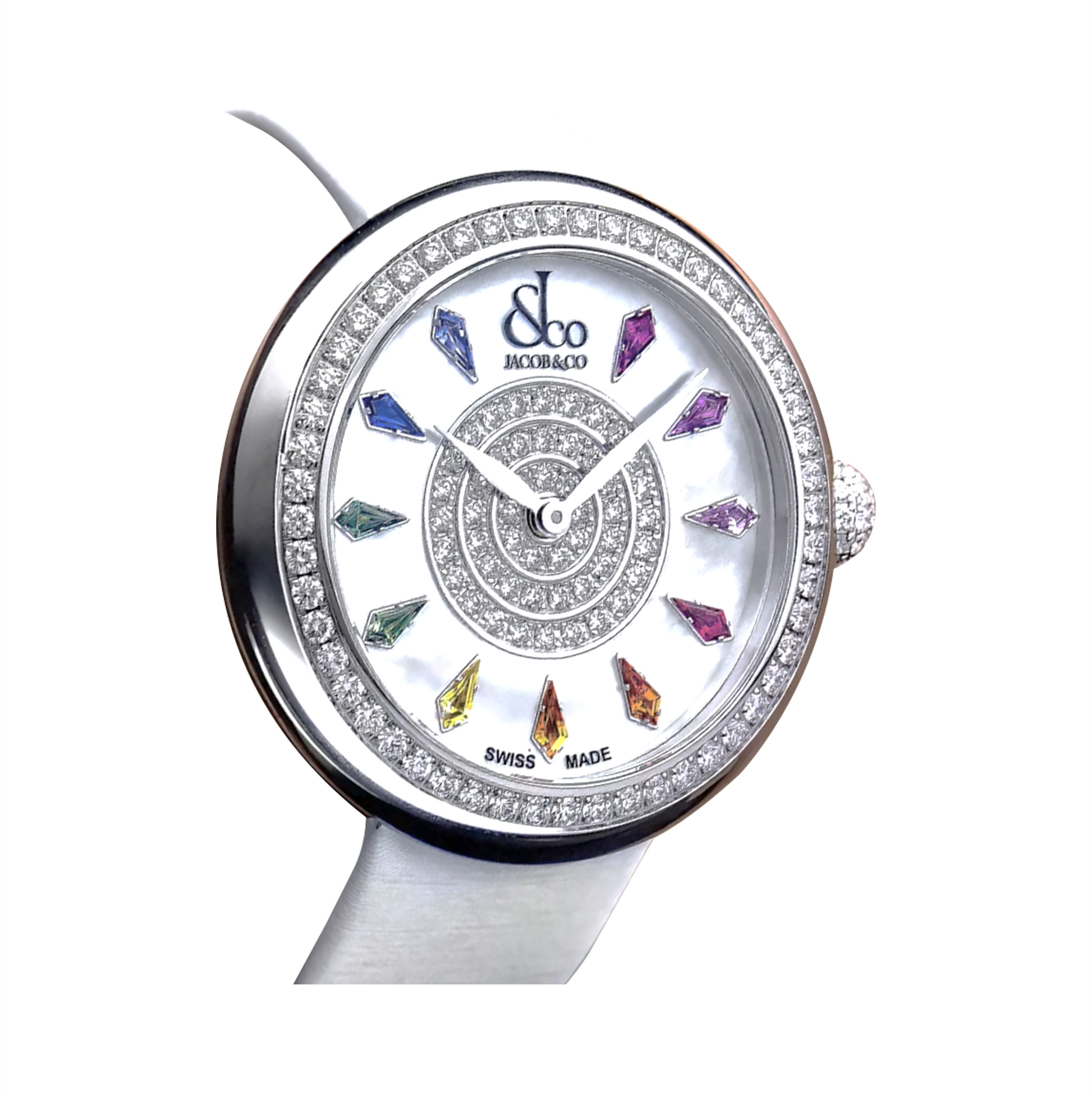 A 38 mm stainless steel timepiece where elegance meets gem-driven expression. Inspired by the idea of transformative brilliance, this watch is powered by the JCGQ01 quartz movement, with hour and minute functions ensuring precision and reliability. The case is crafted from stainless steel, with anti-reflective sapphire crystals up front and staimless steel on the caseback, and offers 30 m water resistance. The dial combines white mother-of-pearl and 18K white gold elements, forming a luxurious base for the gem-set hour markers and detailing.