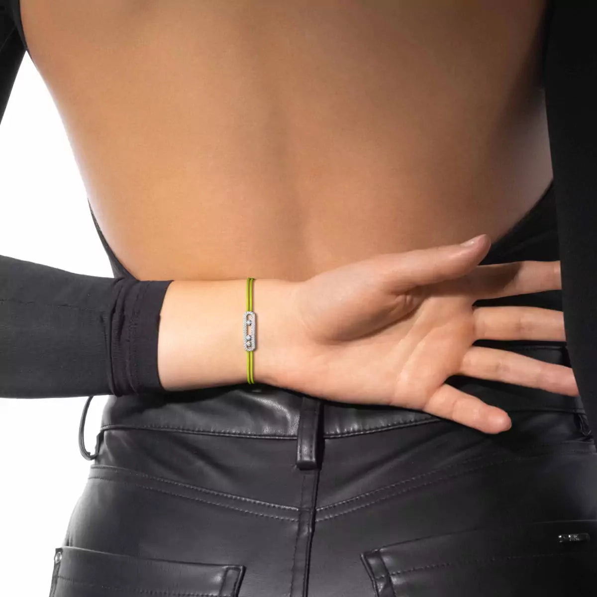 - Material: 18K white gold with adjustable neon yellow cord