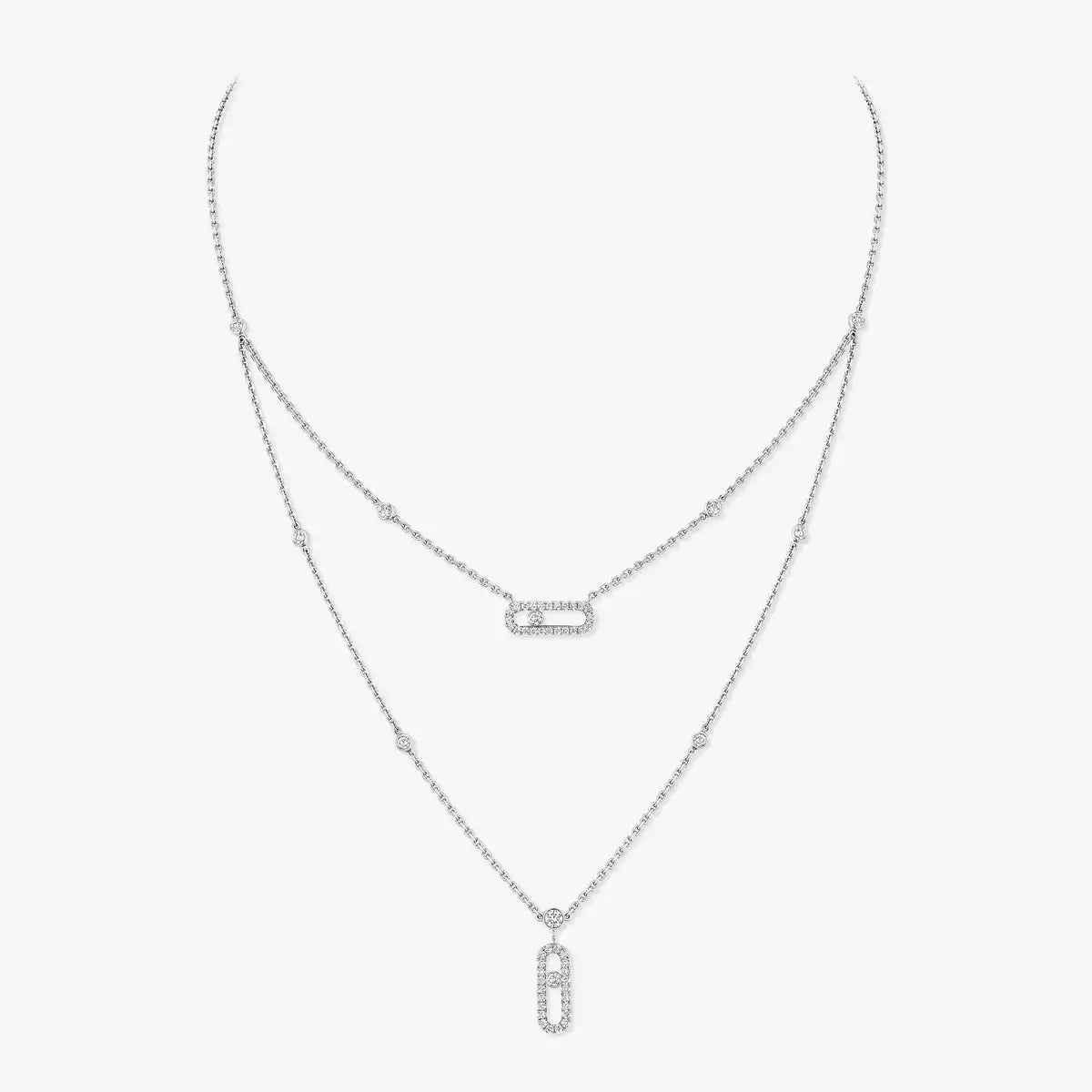 A graceful layering of light and luxury, the Messika Move Uno 2 Rows Pavé Necklace 07174-WG in 18K white gold blends dual-chain elegance with dazzling pavé motifs. The necklace holds 0.50 carat of G/VS quality diamonds, set into a 14 mm × 5.4 mm motif that draws the eye, while the dual rows create a subtle, rhythmic harmony. Suspended from a 45 cm chain with five closure positions (36/39/41/43/45 cm), it adjusts to sit just right, whether close to the collarbone or slightly lower.