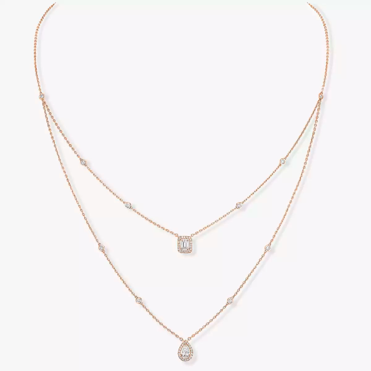 A refined fusion of architectural precision and radiant brilliance, the Messika My Twin 2-Rows Diamond Necklace 06506-PG in 18K pink gold reimagines the art of layering with its dual-chain design. Each chain features a central diamond: a 0.20 ct pear-cut and a 0.20 ct emerald-cut, both of exceptional F/VS quality. The interplay between the angular emerald cut and the rounded pear cut creates a captivating light effect, embodying Valérie Messika’s signature blend of geometry and grace. This necklace, with its 60 cm adjustable length, is designed to elegantly frame the neckline, making it a versatile piece for both day and evening wear.