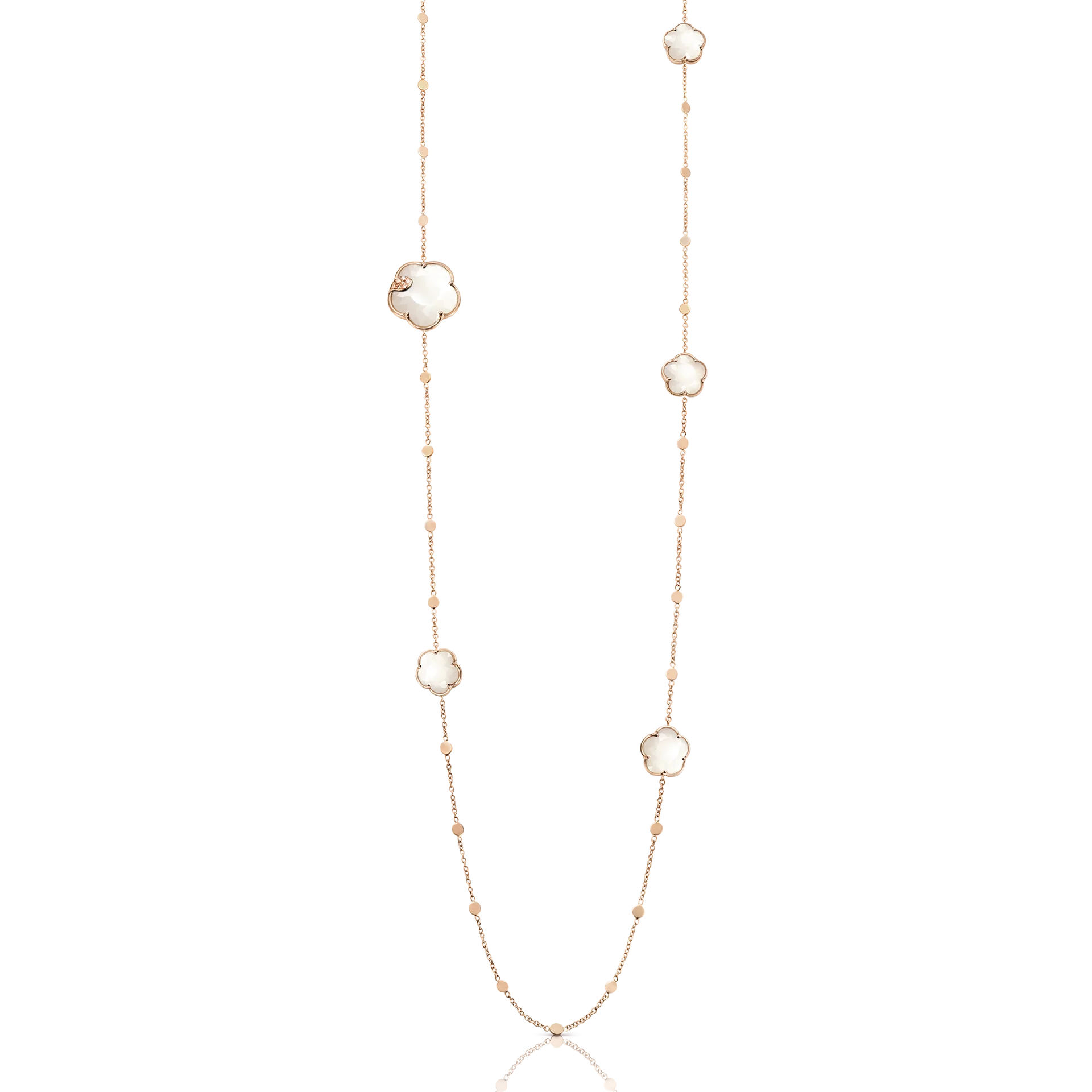 A poetic tribute to the moon’s quiet radiance, the Pasquale Bruni Ton Joli Lunaire Sautoir 16688R in 18K rose gold combines celestial charm with artisanal mastery. Delicate floral motifs of moonstone and mother-of-pearl doublets float along the 102 cm chain, each accented with white diamonds (0.04 ct) and champagne diamonds (0.06 ct) for a subtle, shimmering glow. The pendant flowers, measuring 12 mm and 19 mm, capture light with every movement, making this piece both a statement of refined elegance and a talisman of feminine poetry.