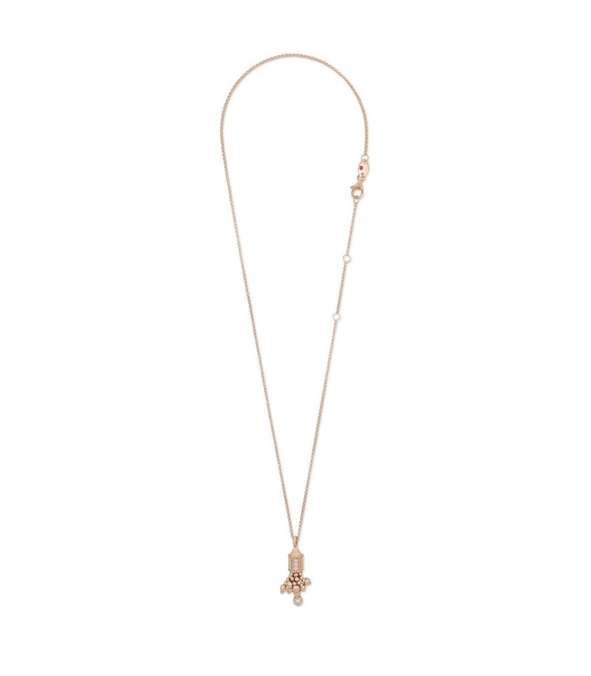The Roberto Coin ADR888CL2246_R necklace is a testament to the brand's dedication to timeless elegance and intricate craftsmanship. Crafted from 18 kt rose gold, the pendant showcases a refined Art Deco-inspired design, characterized by clean lines and geometric precision. At its center, a cluster of pavé-set white diamonds (totaling approximately 0.15 ct, G color, VS clarity) adds a touch of brilliance, enhancing the pendant's sophisticated allure. The pendant is suspended from a delicate rose gold chain, offering a graceful presence that complements both day and evening attire. True to Roberto Coin's signature, a hidden ruby is set within the clasp, symbolizing passion and good fortune.
