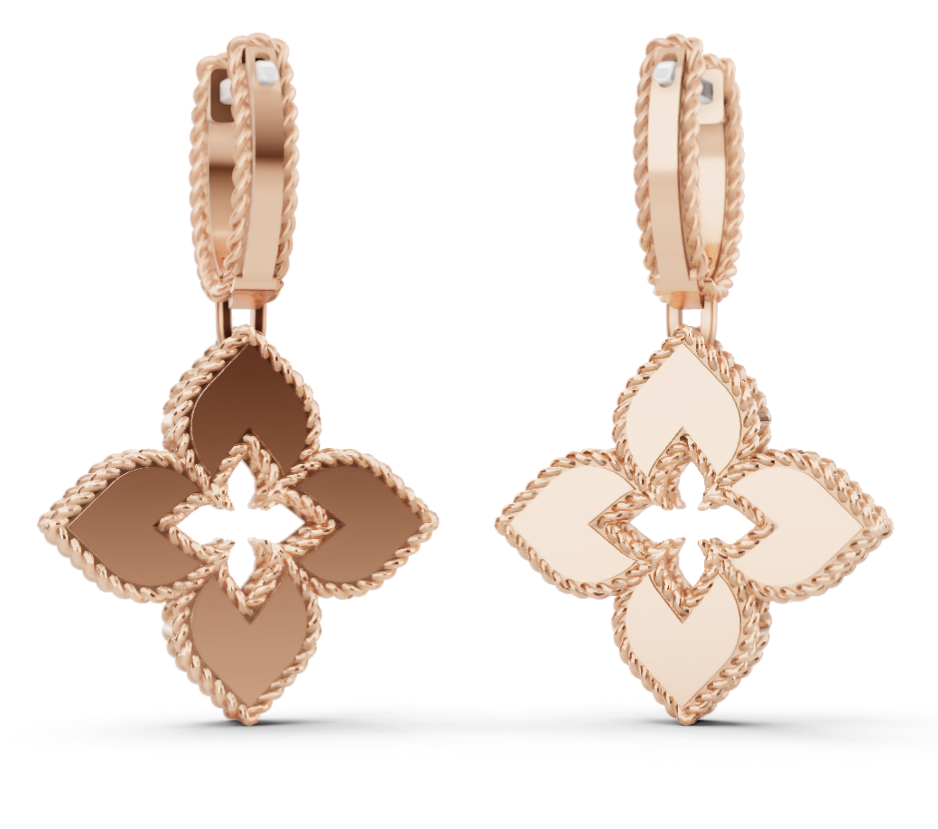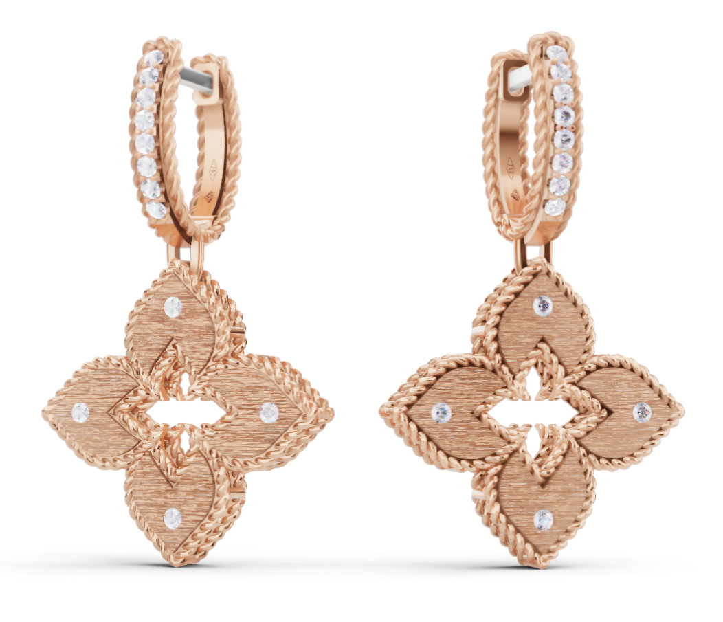 A luminous pair of Venetian Princess earrings in 18 kt rose gold, these elegant studs feature a floral motif adorned with pavé-set white diamonds (total approx. 0.24 ct, G color, VS clarity, round brilliant cut) that radiate timeless brilliance. The earrings measure 30 mm in length and 20 mm in width, offering a bold yet graceful presence. Handmade craftsmanship ensures each piece is unique, while the design embodies understated sophistication and the signature artistry of Roberto Coin.