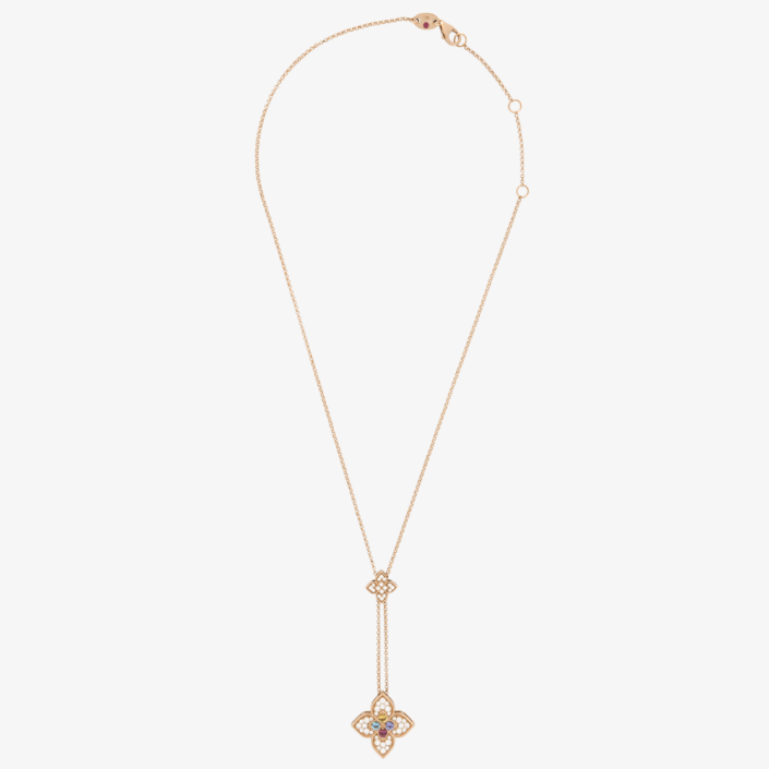 The Princess Flower Pendant from Roberto Coin's esteemed collection is a harmonious blend of elegance and artistry. Crafted in 18 kt rose gold, the pendant showcases a stylized four-petal flower motif, each petal meticulously adorned with pavé-set white diamonds, totaling approximately 0.47 ct (G color, VS clarity, round brilliant cut). At the heart of the flower lies a vibrant center enriched with multicolored gemstones—blue, yellow, pink, and lilac—adding a touch of whimsy and color to the design. The pendant is suspended from an adjustable chain, allowing for versatile styling options. True to Roberto Coin's signature, a hidden ruby is set within the clasp, symbolizing passion and good fortune.