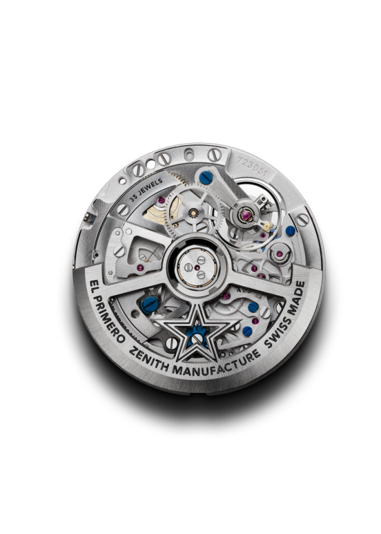 - Movement (Calibre): Zenith El Primero 3604 automatic chronograph; high-frequency 5 Hz (36,000 vph); column-wheel control; central 1/10-second hand completing rotation every 10 s; 60-second and 60-minute counters; small seconds; date; silicon escapement; COSC-certified; approx. 60-hour power reserve