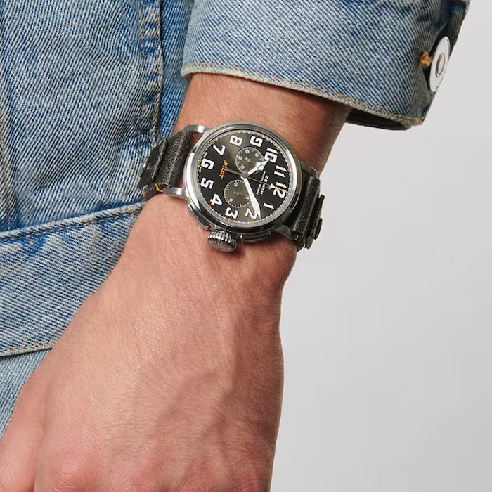 A vintage-inspired 45 mm Pilot Type 20 Rescue Chronograph in brushed stainless steel, featuring a textured slate-grey sunray dial with bold, Super-LumiNova®-filled Arabic numerals and an oversized crown for a historical aviator aesthetic. Powered by the El Primero 4069 automatic chronograph calibre, this high-frequency engine (5 Hz / 36,000 vph) delivers a 50-hour power reserve. The robustness of its construction is echoed in its sapphire crystal with anti-reflective coating, aviation-inspired logo engraving on the caseback, and 100 m water resistance—paired with a vintage-style riveted calfskin leather strap and classic pin buckle for a rugged, timeless look.