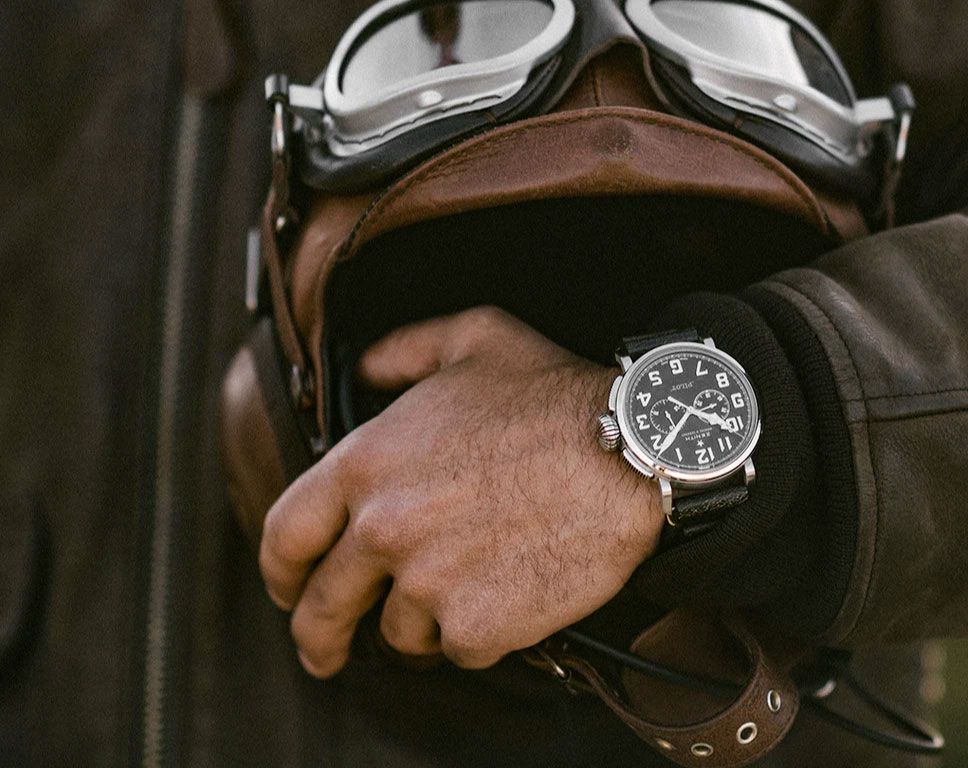 - Strap: Black vintage calfskin leather strap with rivets for a pilot watch aesthetic